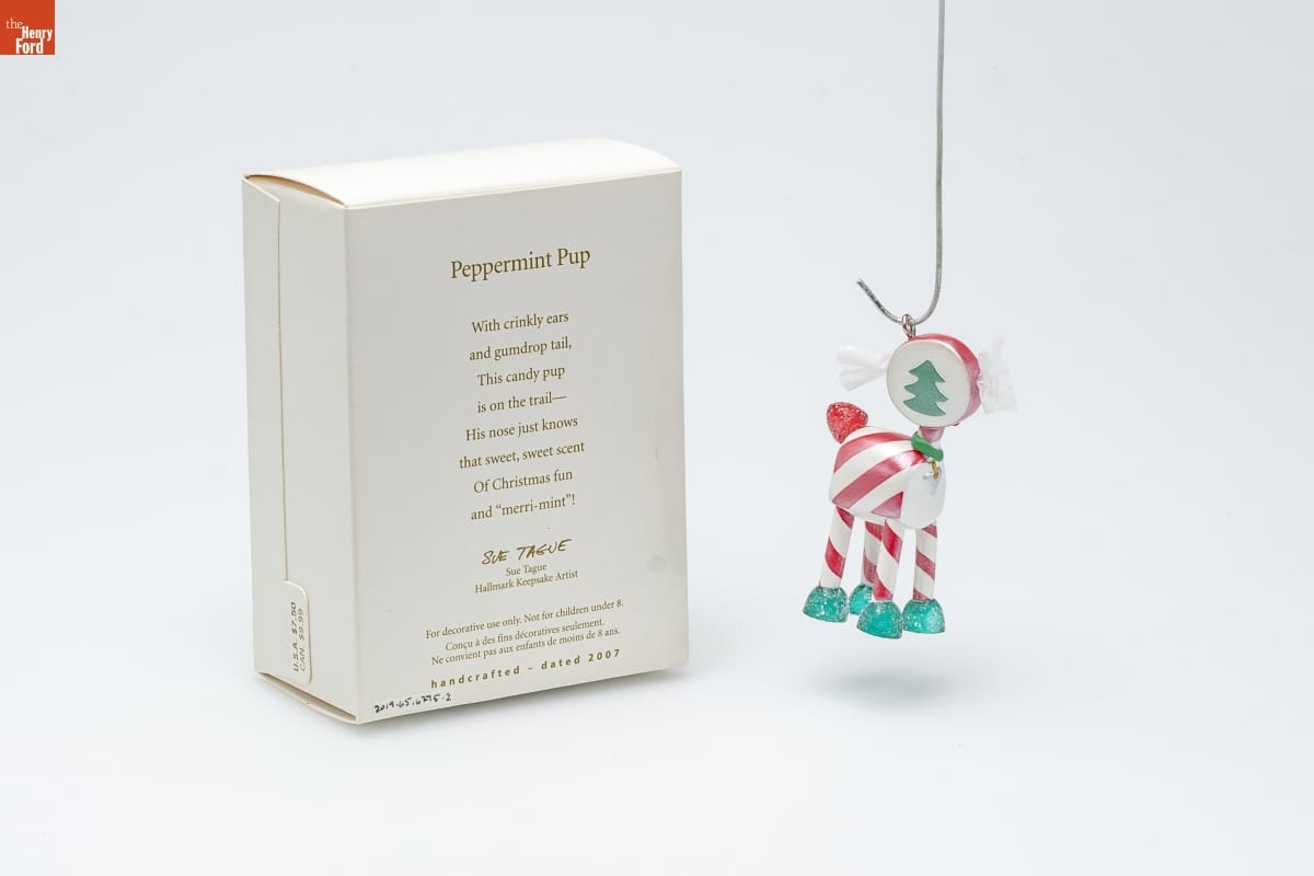 Peppermint Pup / With crinkly ears / and gumdrop tail, / This candy pup / is on the trail-- / His nose just knows / that sweet, sweet scent / Of Christmas fun / and "merri-mint"! / Sue Tague / Hallmark Keepsake Artist / For decorative use only. Not for children under 8. / Concu a des fins decoratives seulement. / Ne convient pas aux enfants de moins de 8 ans. / handcrafted - dated 2007