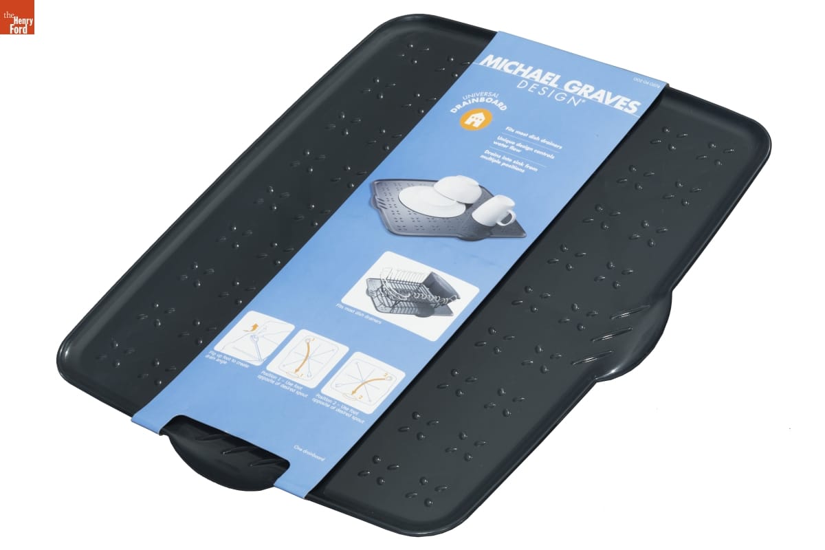 MICHAEL GRAVES / DESIGN (R) / UNIVERSAL / DRAINBOARD / Versatile / Design / Fits most dish drainers / Unique design controls water flow / Drains into sink from multiple positions / Flip up foot to create drain angle / Position 1 - Use foot opposite of desired spout / Position 2 - Use foot opposite of desired spout / MICHAEL GRAVES, recipient of the National Medal of Arts and the American / Institute of Architects' Gold Medal, has been at the forefront of [...] / Michael Graves / Recyclable Paperboard / May not be recyclable in your area / Distributed by Target Corporation / Minneapolis, MN 55403 / Made in China / (c)2010 Target Brands, Inc. / All Rights Reserved Shop Target.com