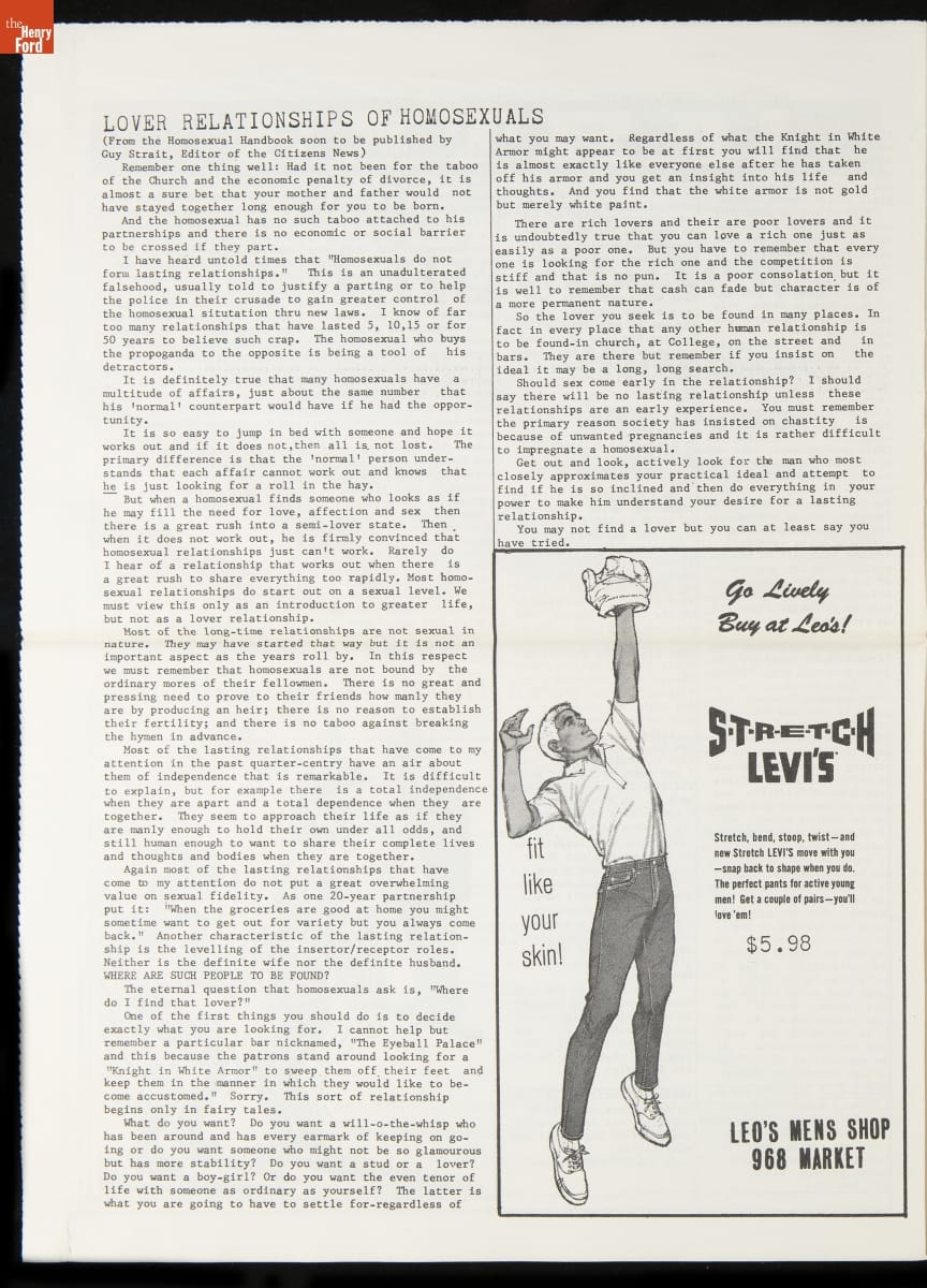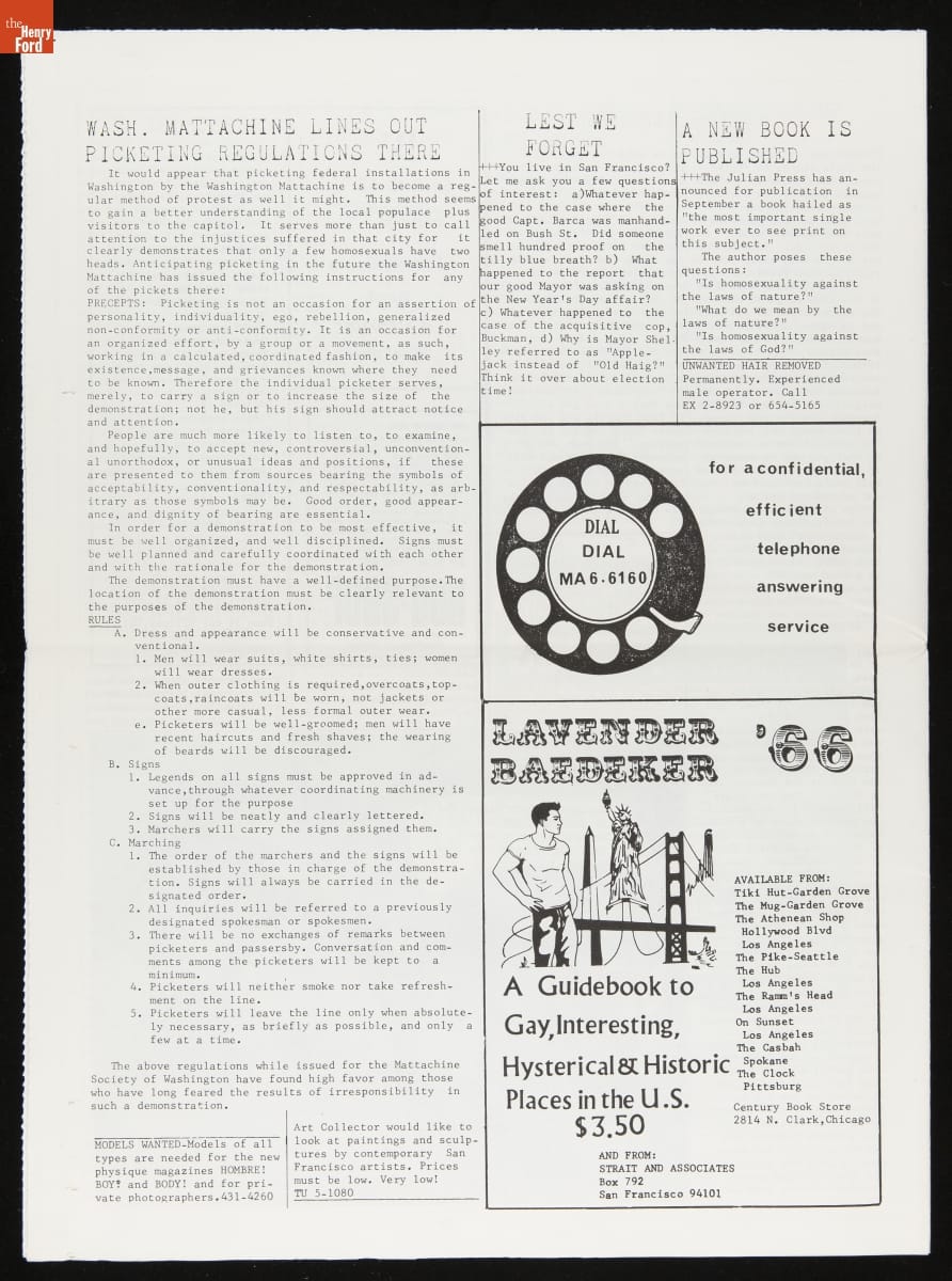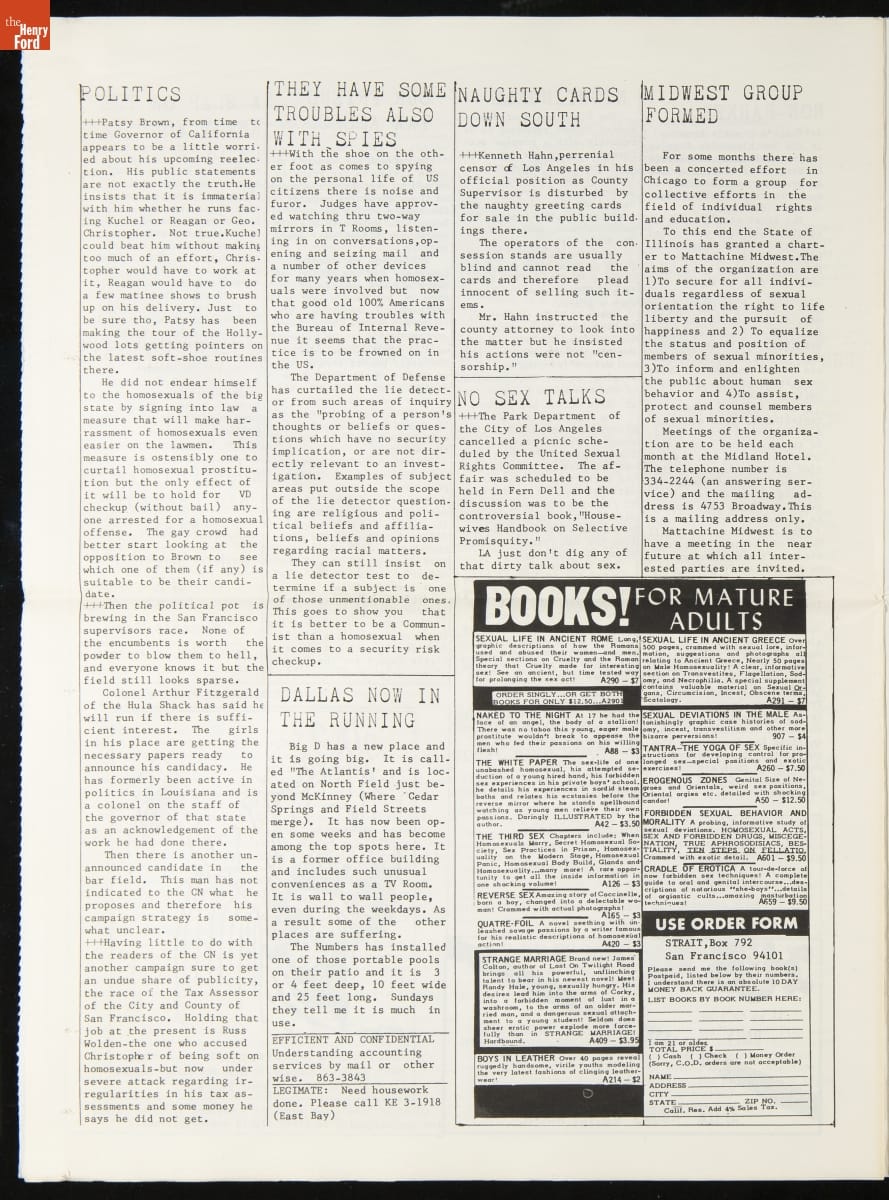 LGBTQ+ newspapers became more available beginning in the 1950s as organizations added print media to their activist tool kit. These newspapers were a regionally focused way to rally the LGBTQ+ community, share information, and fight discrimination. Many of these newspapers came to rely on gay bars as a location for disbursement as they were among the only private gay spaces in many cities.