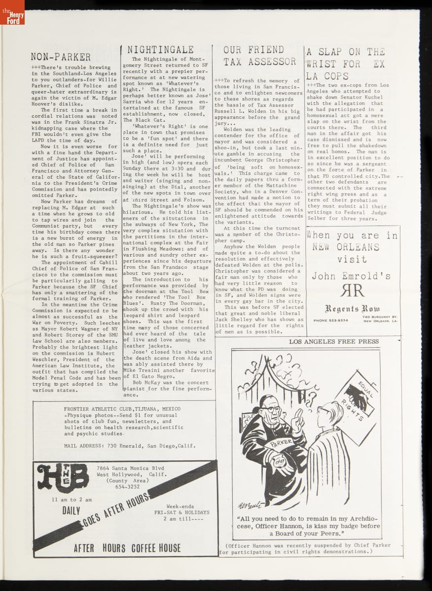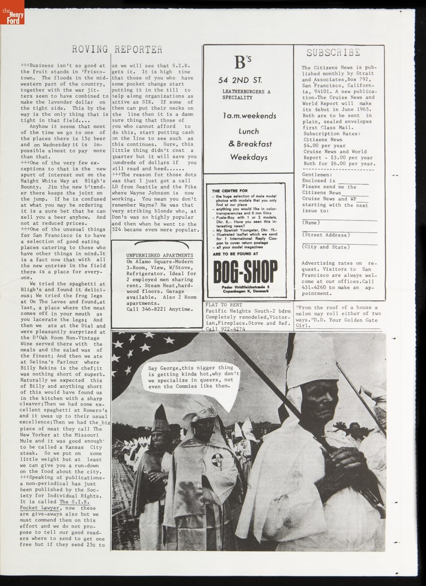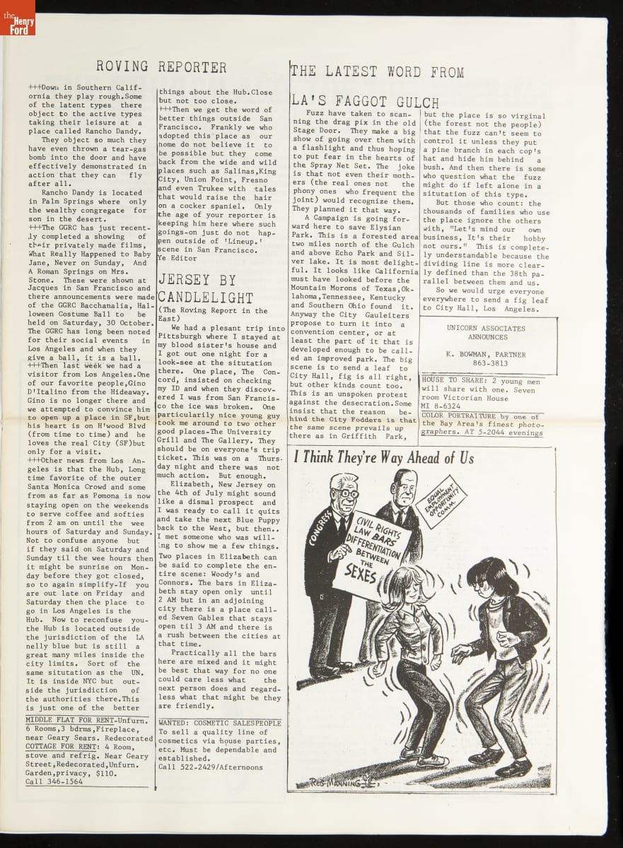 LGBTQ+ newspapers became more available beginning in the 1950s as organizations added print media to their activist tool kit. These newspapers were a regionally focused way to rally the LGBTQ+ community, share information, and fight discrimination. Many of these newspapers came to rely on gay bars as a location for disbursement as they were among the only private gay spaces in many cities.