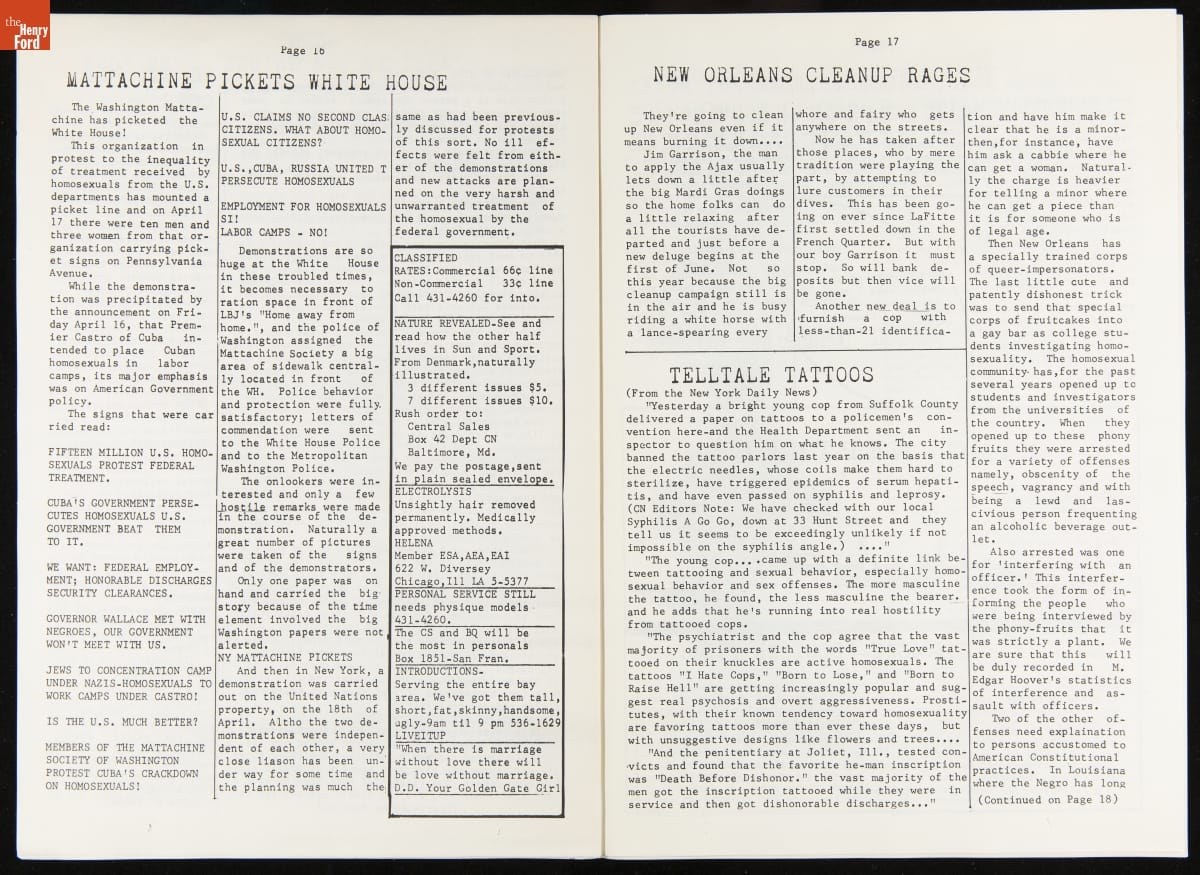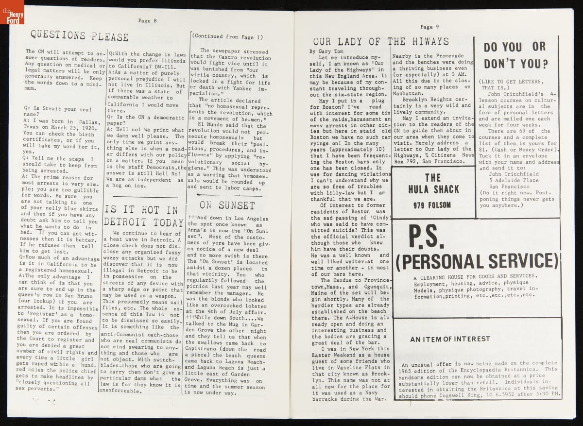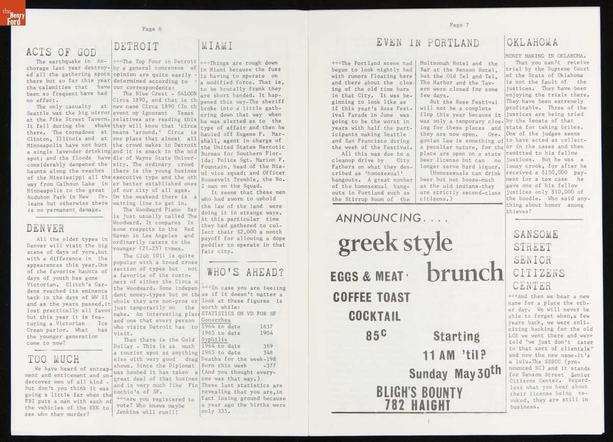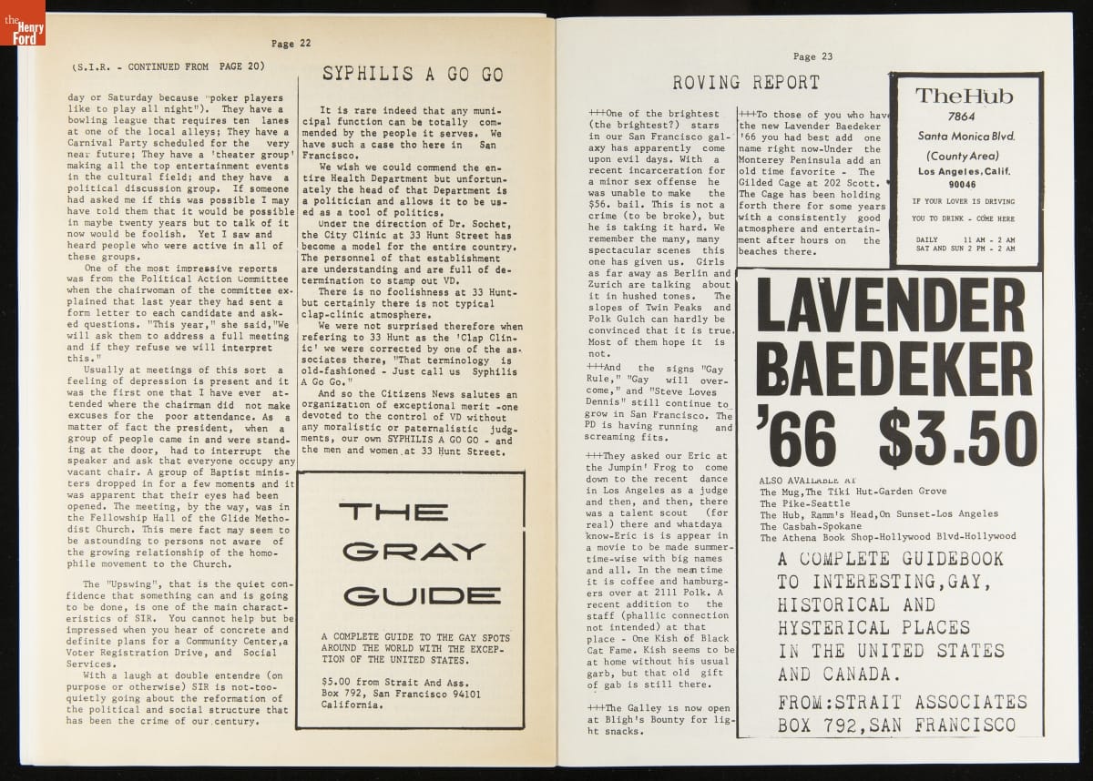 LGBTQ+ newspapers became more available beginning in the 1950s as organizations added print media to their activist tool kit. These newspapers were a regionally focused way to rally the LGBTQ+ community, share information, and fight discrimination. Many of these newspapers came to rely on gay bars as a location for disbursement as they were among the only private gay spaces in many cities.