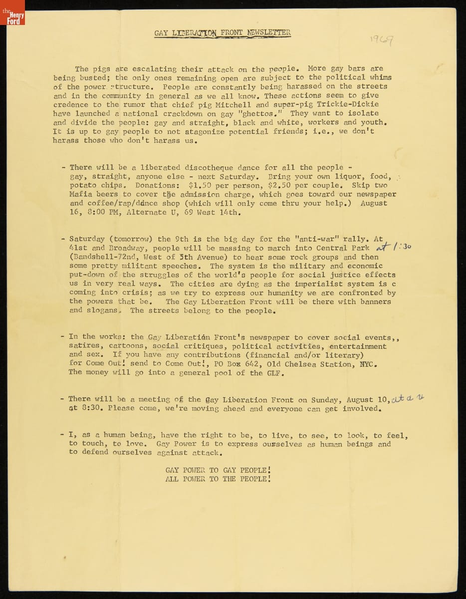 On June 28, 1969, New York police raided the Stonewall Inn--a gay club in Greenwich Village--and harassed, arrested, and maltreated its LGBTQ+ patrons. Police raids on LGBTQ+ bars were common, but this particular raid sparked a movement. These fliers evidence the fraught months following the Stonewall Uprising and the efforts of gay rights groups to organize and fight for equality.