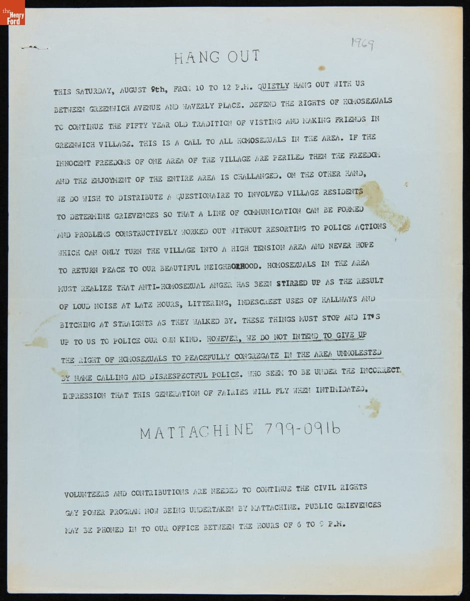 On June 28, 1969, New York police raided the Stonewall Inn--a gay club in Greenwich Village--and harassed, arrested, and maltreated its LGBTQ+ patrons. Police raids on LGBTQ+ bars were common, but this particular raid sparked a movement. These fliers evidence the fraught months following the Stonewall Uprising and the efforts of gay rights groups to organize and fight for equality.