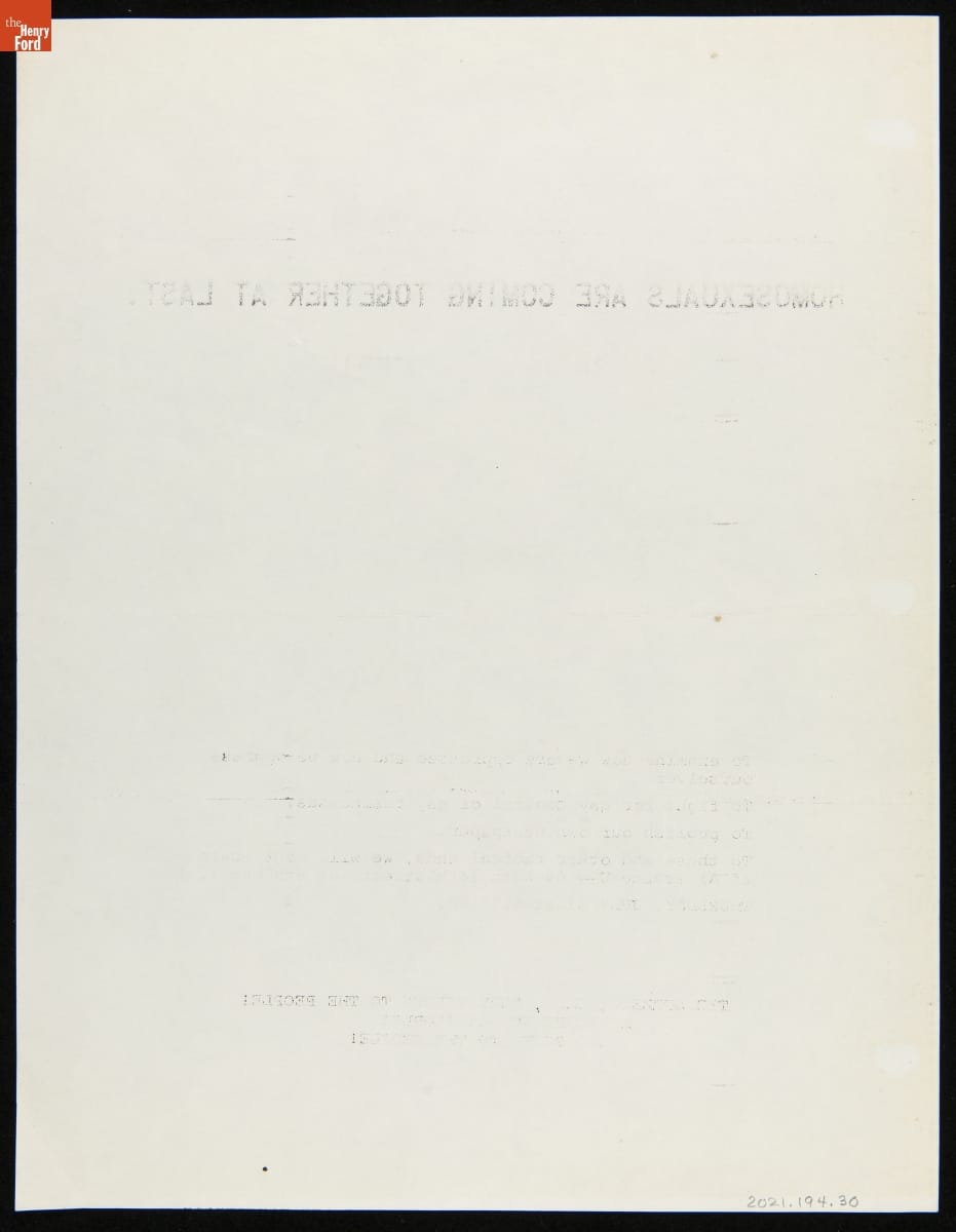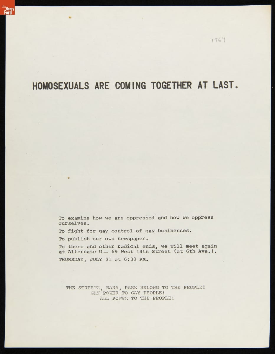 On June 28, 1969, New York police raided the Stonewall Inn--a gay club in Greenwich Village--and harassed, arrested, and maltreated its LGBTQ+ patrons. Police raids on LGBTQ+ bars were common, but this particular raid sparked a movement. These fliers evidence the fraught months following the Stonewall Uprising and the efforts of gay rights groups to organize and fight for equality.