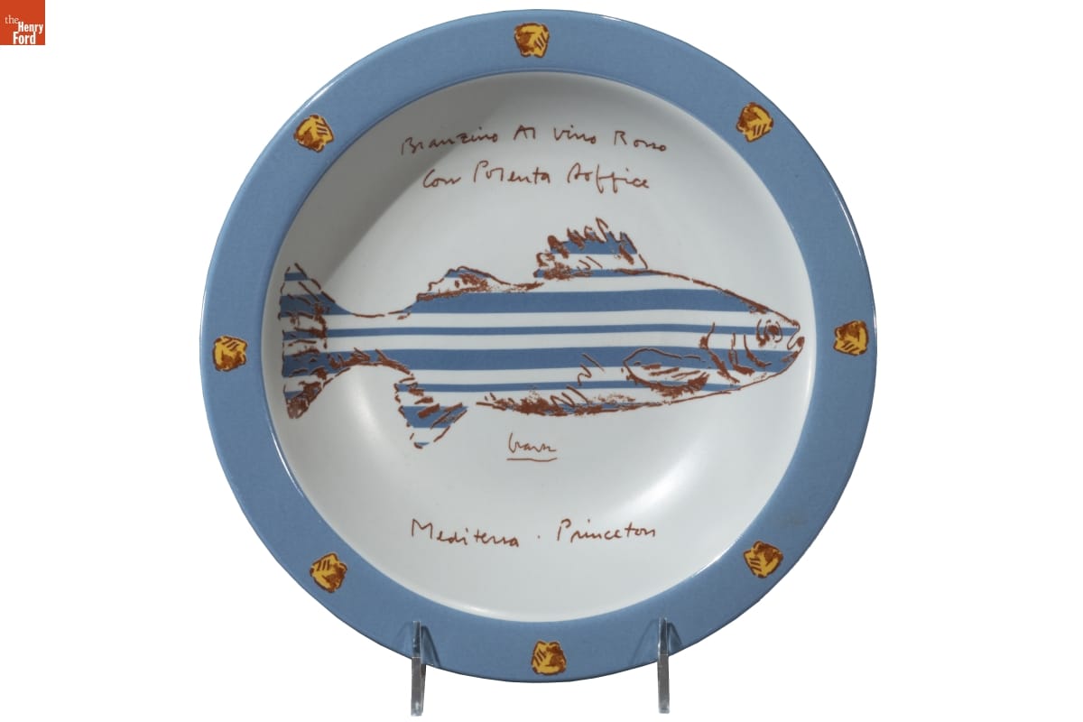 Graves / (c) MICHAEL GRAVES / BRANZINO AL VINO ROSSO CON POLENTA SOFFICE / MEDITERRA PRINCETON, NJ / LIMITED EDITION DESIGNED BY THE ARTIST TO BENEFIT CHARITABLE / ORGANIZATIONS DEDICATED TO / BRING HOPE AND HELP TO CHILDREN IN / NEED AROUND THE WORLD. / THE ARTIST DOES NOT DERIVE ANY / INCOME FROM THE SALE OF THIS PLATE. / MICROWAVE OVEN AND DISHWASHER SAFE / PRINTED BY CROMOCOLOR / MADE IN ITALY / Mancioli / Porcellana dei Medici / Firenze / BUON RICORDO AMERICA - 2000 / No. 400/500
