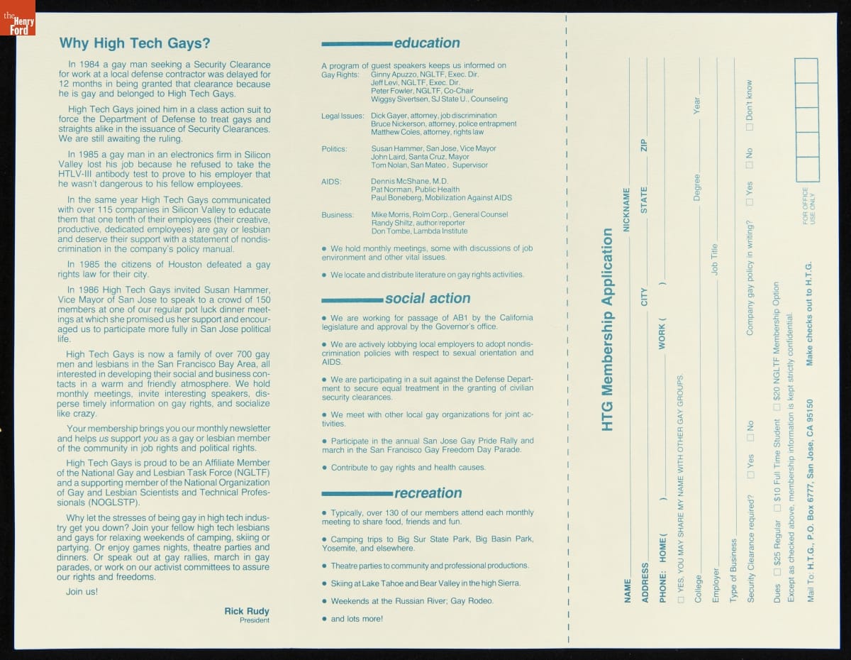 High Tech Gays (HTGs) began in 1983 as a Silicon Valley-based social club and political action group. In 1984, the group was a co-defendant in a federal court case--High Tech Gays vs. DISCO--arguing that LGBTQ+ people were being denied access clearance to work in military and sensitive tech industries. The court ruled in favor of the High Tech Gays but was later overturned and appealed.