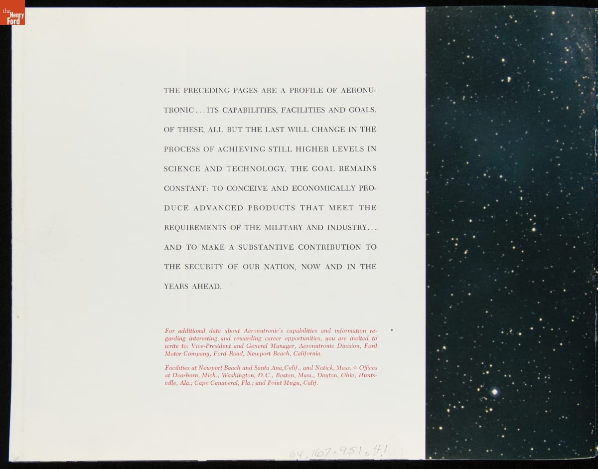 Ford Motor Company established the core of its aerospace division in 1956. Based in Newport Beach, California, the division and its subsidiaries manufactured satellites, missiles, and defense systems. It also played an important role in developing the Mission Control facility near Houston, Texas, that directed NASA's Gemini and Apollo space missions. Ford sold its aerospace division in 1990.