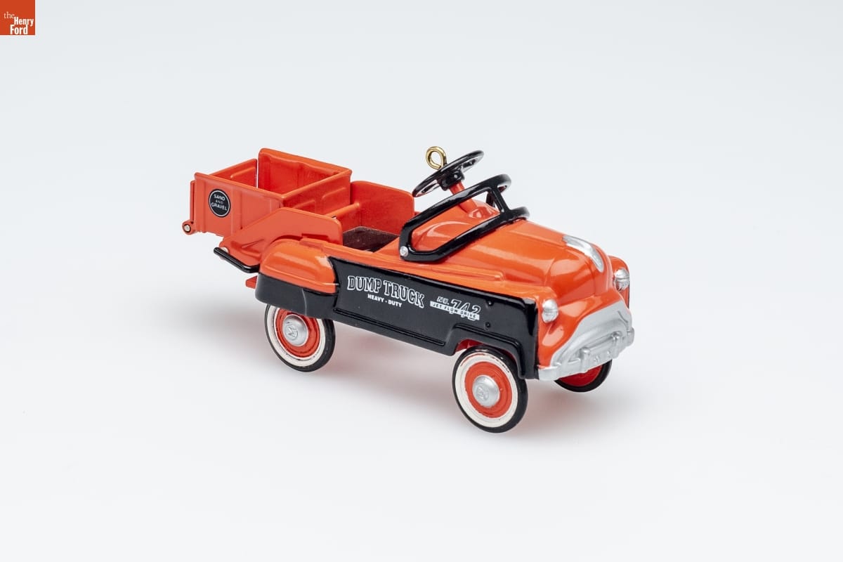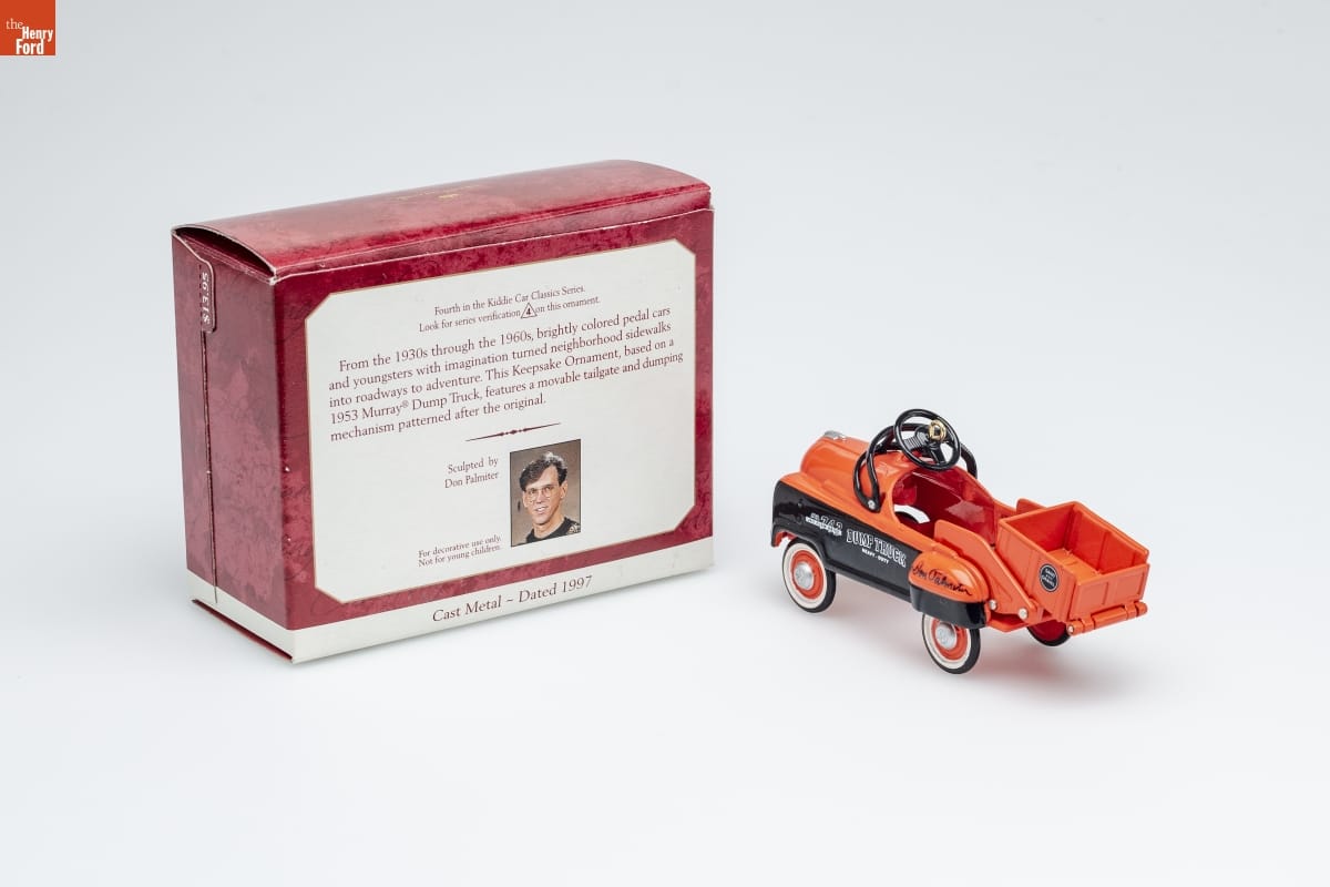 Fourth in the Kiddie Car Classics Series. / Look for series verification 4 on this ornament. / From the 1930s through the 1960s, brightly colored pedal cars / and youngsters with imagination turned neighborhood sidewalks / into roadways to adventure. This Keepsake Ornament, based on a / 1953 Murray(R) Dump Truck, features a movable tailgate and dumping / mechanism pattern after the original. / Sculpted by / Don Palmiter / For decorative use only. / Not for young children / Cast Metal - Dated 1997