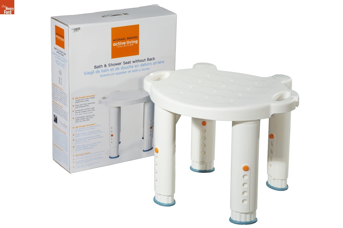 MICHAEL GRAVES / active living / COLLECTION (TM) / Bath & Shower Seat without Back / Easy snap and click assembly and disassembly / MG Orange Activates (TM) / Large pins make height adjustment easy / Height adjusts from 16.25" - 21.5" / Seat has built-in handles with hand-held shower holder and drainage holes / Will not slip, slide, or scratch shower or tub / Manufactured and Distributed / by Drive Medical / Port Washington, NY 11050 / (c)2006 Drive Medical, Inc. / www.drivemedical.com / drive / MEDICAL DESIGN & MANUFACTURING / Model MG12171 / 21.5" H x 22.25" W x 17.75" D / 54.6 cm x 46.5 cm x 45.1 cm