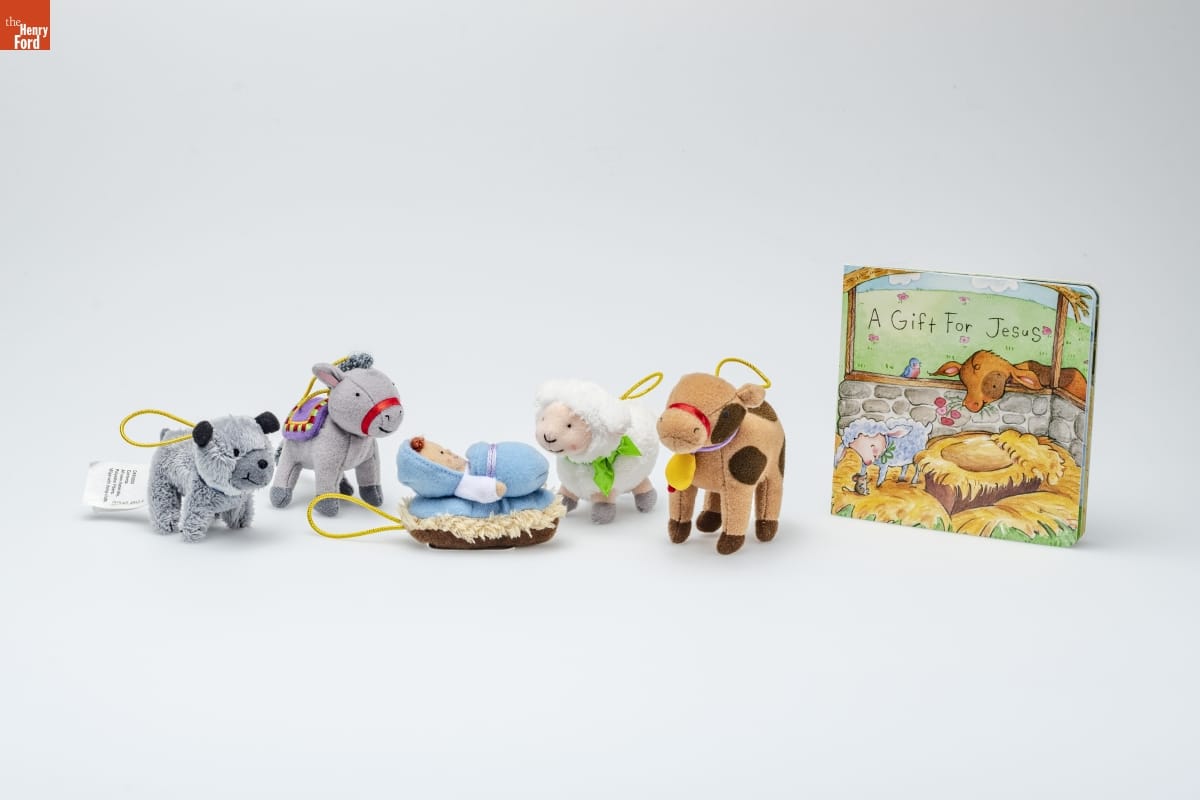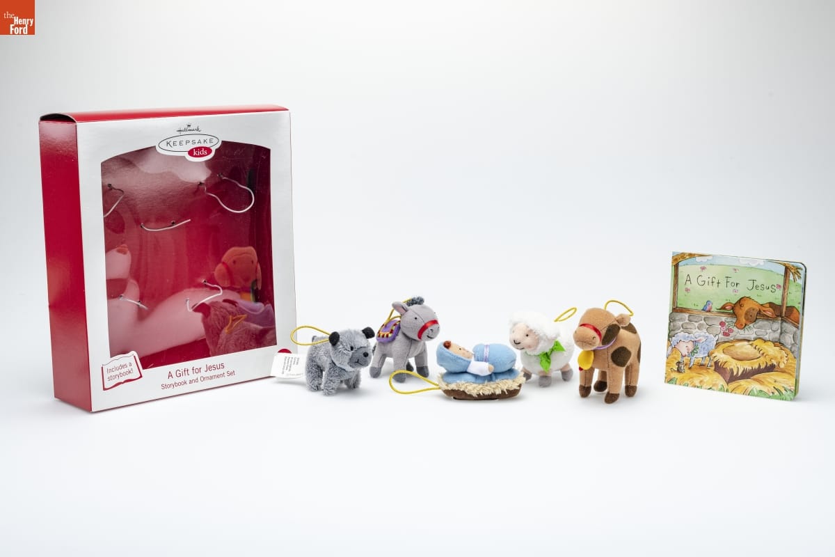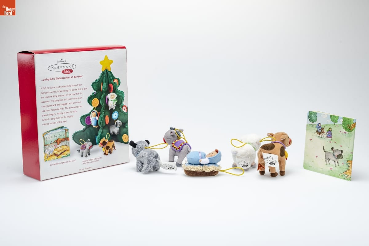 Hallmark / KEEPSAKE / kids / ...giving kids a Christmas that's all their own! / A Gift for Jesus is a heartwarming story of four / barnyard animals lucky enough to be the first to give / the newborn King presents on the day that He / was born. The storybook and five-ornament set / coordinates with the huggably soft Christmas / tree from Keepsake Kids. The ornaments have / elastic hangers, making it easy for little / hands to hang them on the brightly / colored buttons of the tree! / story written especially for kids! / hand-stitched ornaments / bring the story to life! / Tree sold separately.