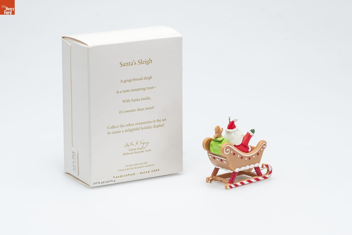 Santa's Sleigh / A gingerbread sleigh / is a taste-tempting treat-- / With Santa inside, / it's sweeter than sweet! / Collect the other ornaments in the set / to create a delightful holiday display! / Edythe Kegrize / Hallmark Keepsake Artist / For decorative use only. / Concu a des fins decoratives seulement. / handcrafted - dated 2009