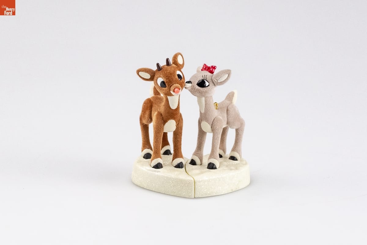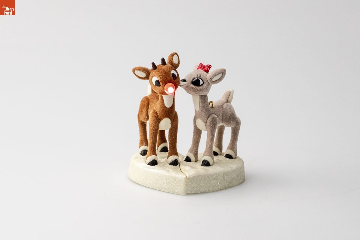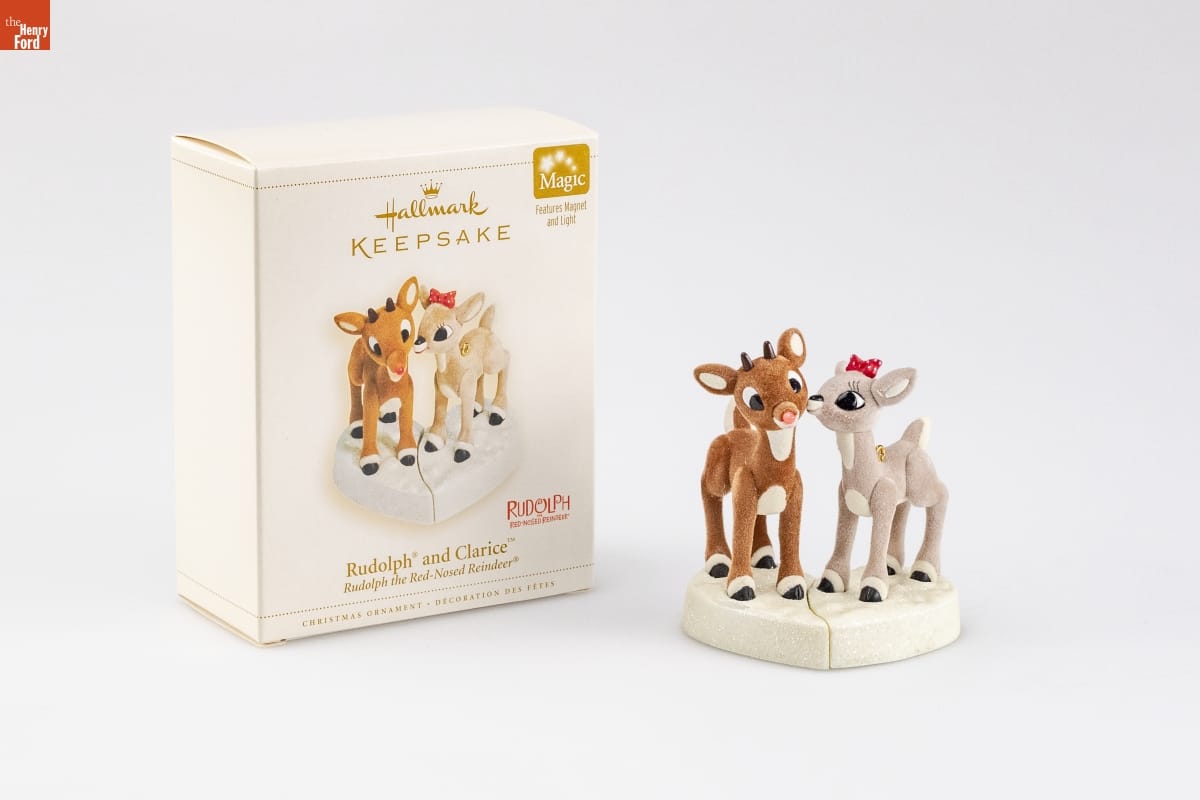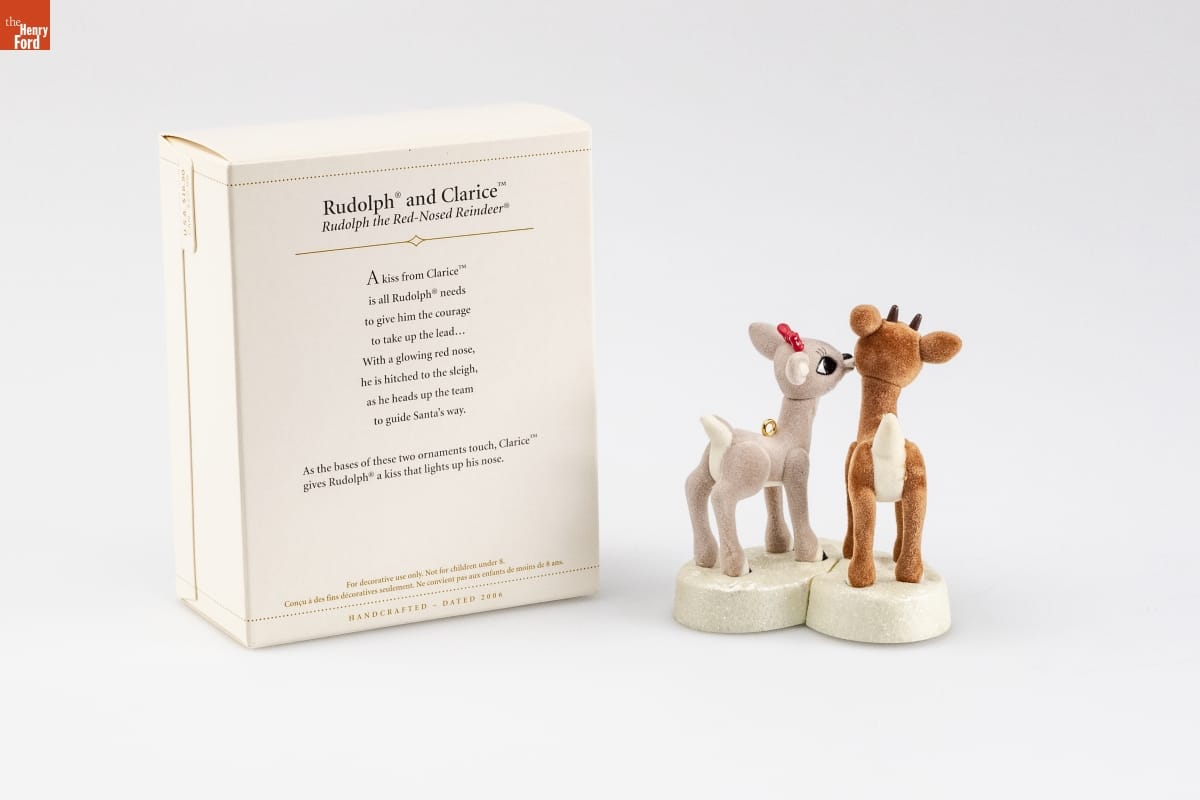 Rudolph(R) and Clarice TM / Rudolph the Red-Nosed Reindeer(R) / A kiss from Clarice TM / is all Rudolph(R) needs / to give him the courage / to take up the lead... / With a glowing red nose, / he is hitched to the sleigh, / as he heads up the team / to guide Santa's way. / As the bases of these two ornaments touch, Clarice TM / gives Rudolph(R) a kiss that lights up his nose. / For decorative use only. Not for children under 8. / Concu a des fins decoratives seulement. Ne convient pas aux enfants de moins de 8 ans. / HANDCRAFTED - DATED 2006