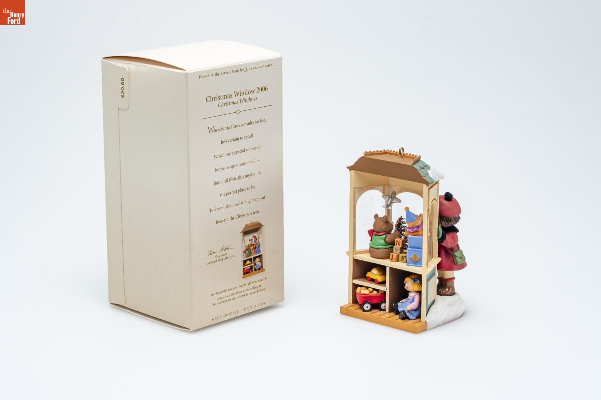 Fourth in the Series. Look for 4 on this ornament. / Christmas Window 2006 / Christmas Windows / When Santa Claus consults his list, / he's certain to recall / Which toy a special someone / hopes to open most of all-- / But until then, this toyshop is / the perfect place to be / To dream about what might appear / beneath the Christmas tree. / Nina Aube / Hallmark Keepsake Artist / For decorative use only. Not for children under 8. / Concu a des fins decoratives seulement. / Ne convient pas aux enfants de moins de 8 ans. / HANDCRAFTED - DATED 2006