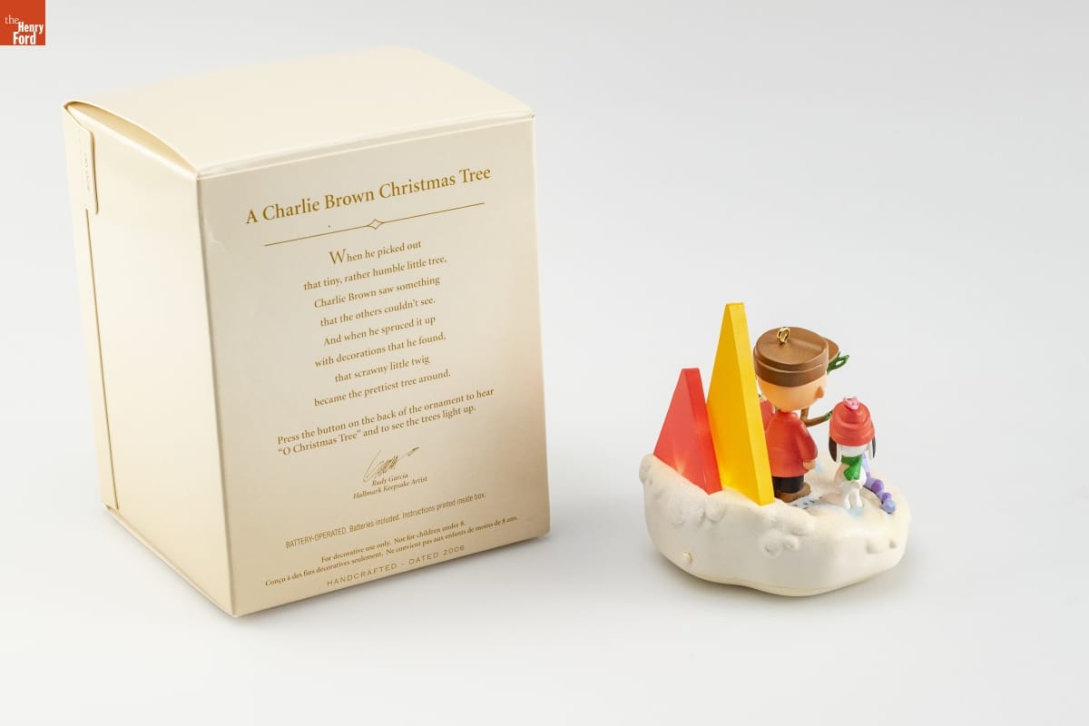A Charlie Brown Christmas Tree / When he picked out / that tiny, rather humble little tree, / Charlie Brown saw something / that the others couldn't see. / And when he spruced it up / with decorations that he found, / that scrawny little twig / became the prettiest tree around. / Press the button on the back of the ornament to hear / "O Christmas Tree" and to see the trees light up. / Rudy Garcia / Hallmark Keepsake Artist / BATTERY-OPERATED. Batteries included. Instructions printed inside box. / For decorative use only. Not for children under 8. / Concu a des fins decoratives seulement. Ne convient pas aux enfants de moins de 8 ans. / HANDCRAFTED - DATED 2006