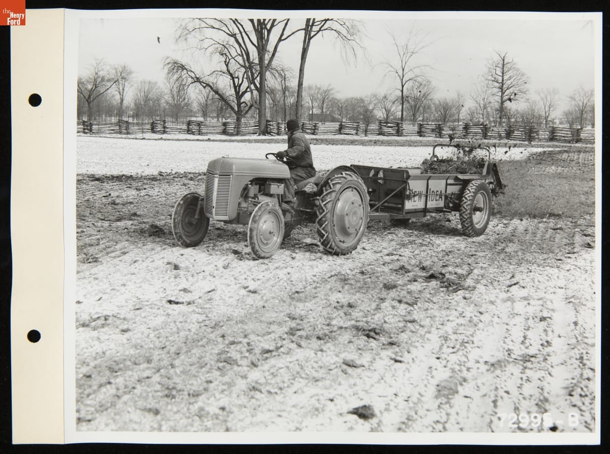 Man Driving a Ford Ferguson Tractor Pulling a Trailer of Manure to Spread over a Field, January 1940