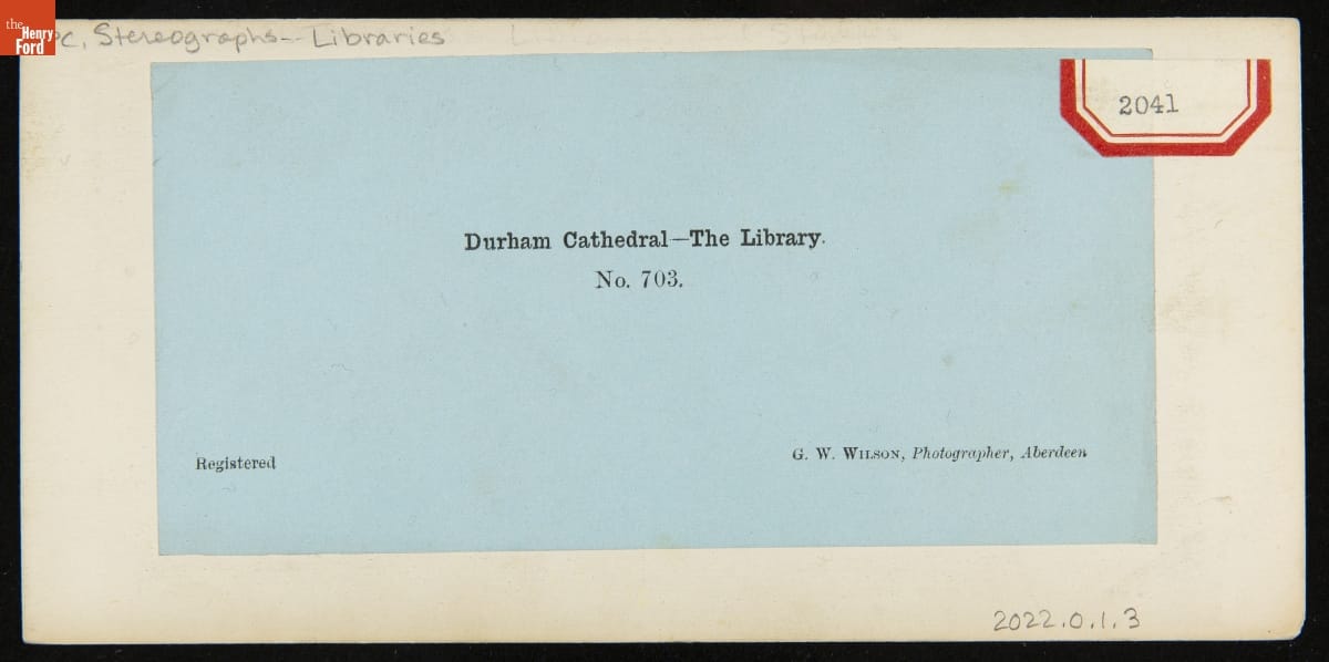 The Durham Cathedral in northern England has housed a collection of religious texts, manuscripts, and secular works since its early founding. Dedicated areas throughout the Cathedral served as a library space over time. The library pictured in this stereograph opened in the mid-1800s to accommodate the Cathedral's growing collection.