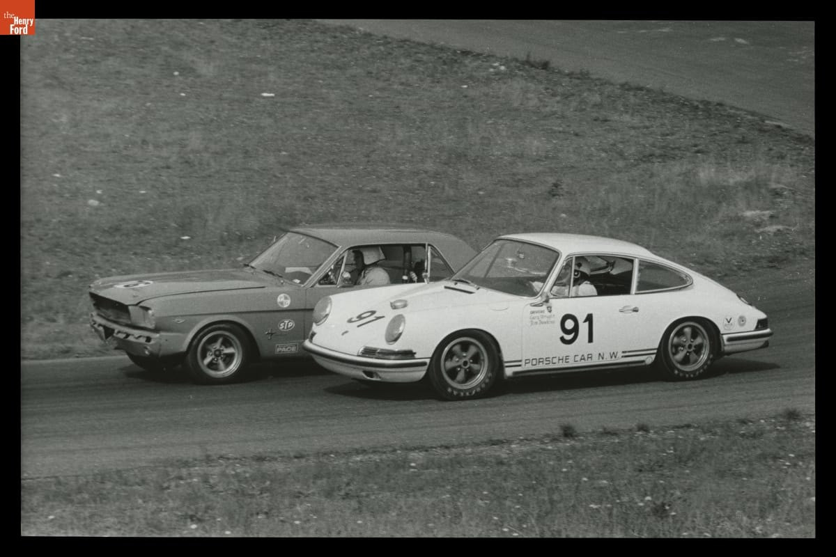 Ford Mustang and Porsche 911 in the Kent 300 Trans Am Race, October 1967