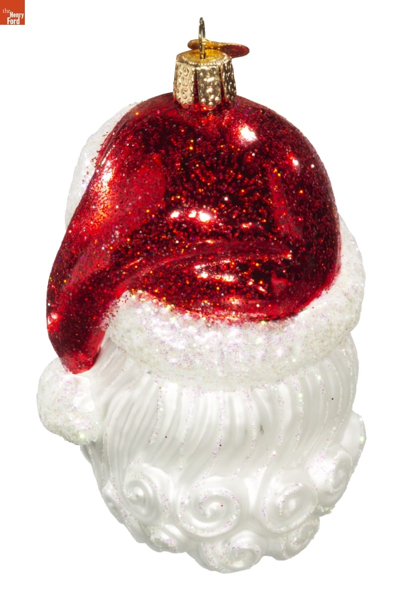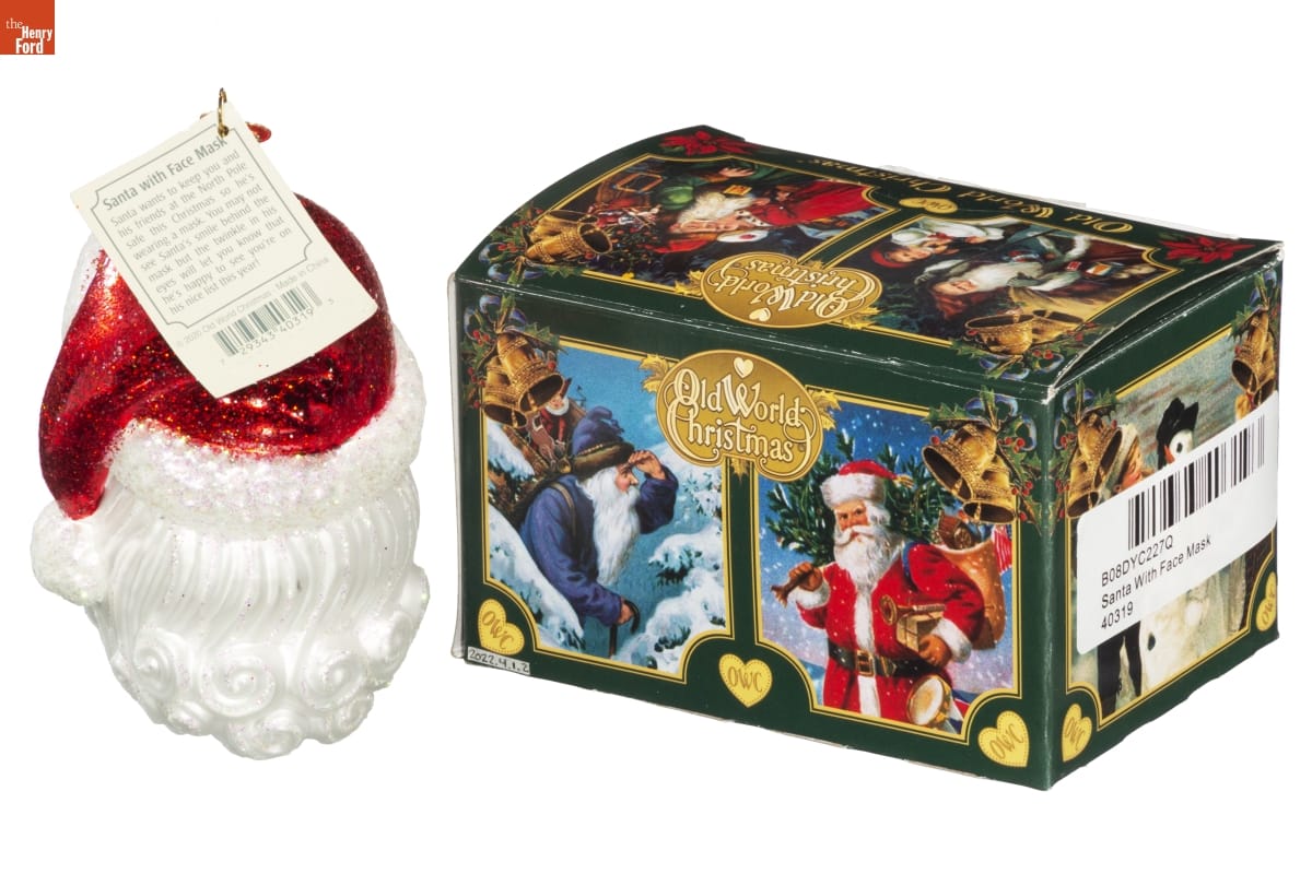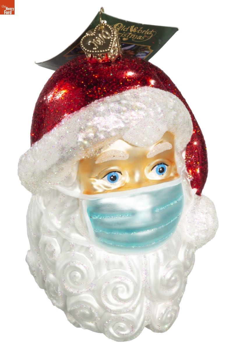 In the 1870s, the first mass-produced Christmas ornaments became a popular way to personalize holiday decor. In the 21st century, manufacturers create intricate ornaments that reference broader culture. Old World Christmas made this Santa in response to the Covid-19 pandemic of the early-2020s; Santa Claus is depicted following health guidelines outlined by the Center for Disease Control at that time.