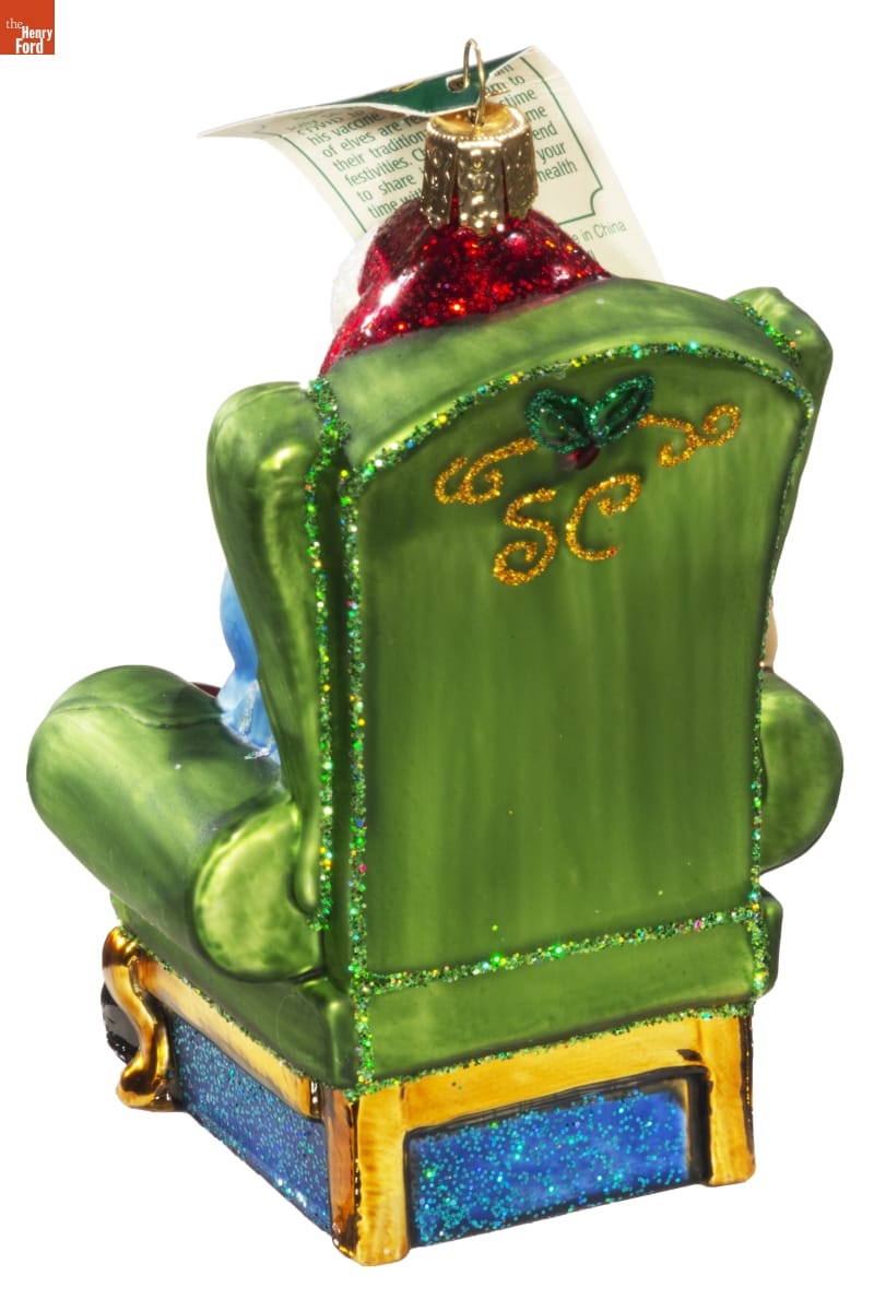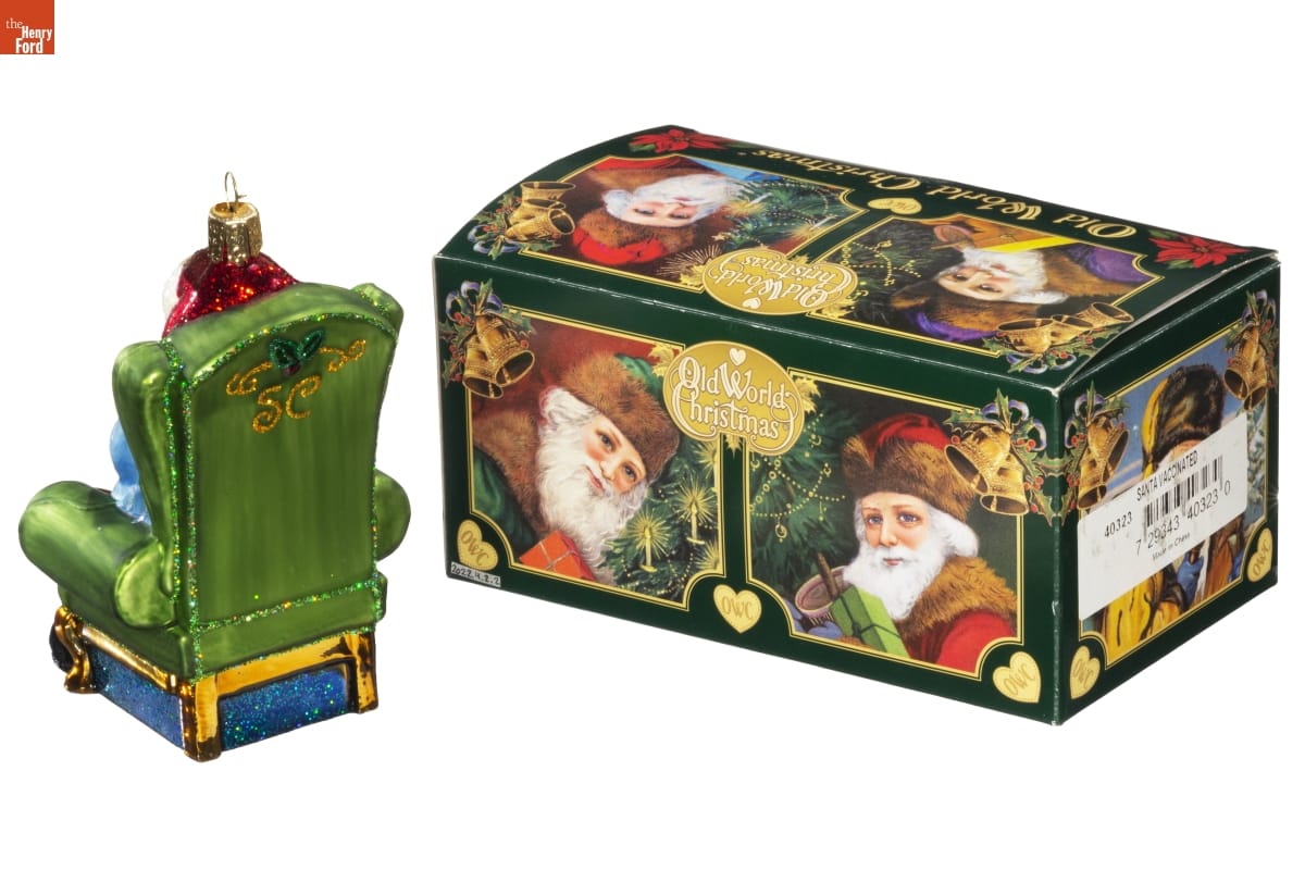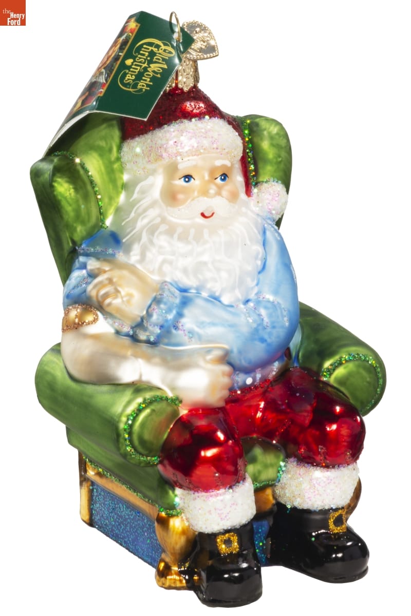 In the 1870s, the first mass-produced Christmas ornaments became a popular way to personalize holiday decor. In the 21st century, manufacturers create intricate ornaments that reference broader culture. Old World Christmas made this Santa in response to the Covid-19 pandemic of the early-2020s; Santa Claus is depicted following health guidelines outlined by the Center for Disease Control at that time.