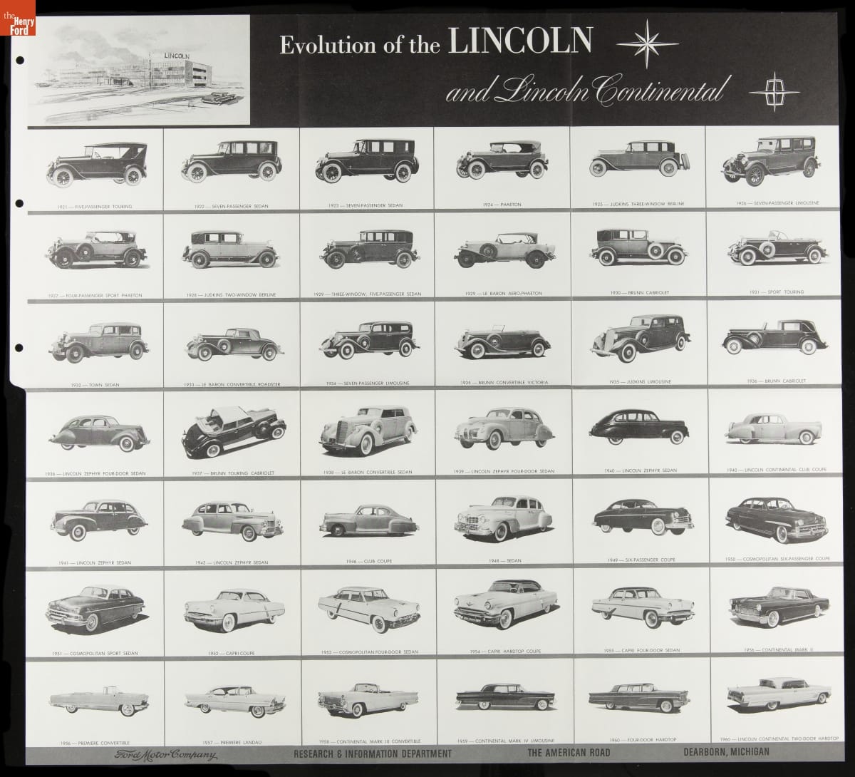 Nearly 40 years of Lincoln evolution are traced in this poster, from the company's founding by Henry Leland and Wilfred Leland, through its renaissance under Ford Motor Company's ownership. Edsel Ford and designer Bob Gregorie inaugurated Lincoln's successful Continental model for 1940. For 1956-1957, Continental was its own make, separate from Lincoln, under the guidance of William Clay Ford.