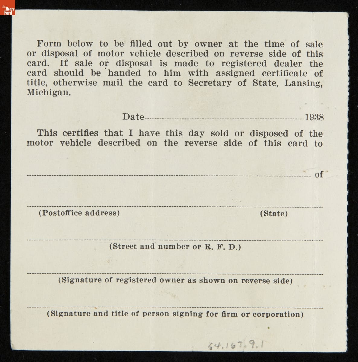 Even Henry Ford had to register his cars with the state. This Michigan certificate of registration covered a 1938 Lincoln owned by the automotive magnate. Total registration cost was $20.60, while the price of the car itself started around $5,900. The average American wage in 1938 was about $1,221 a year.