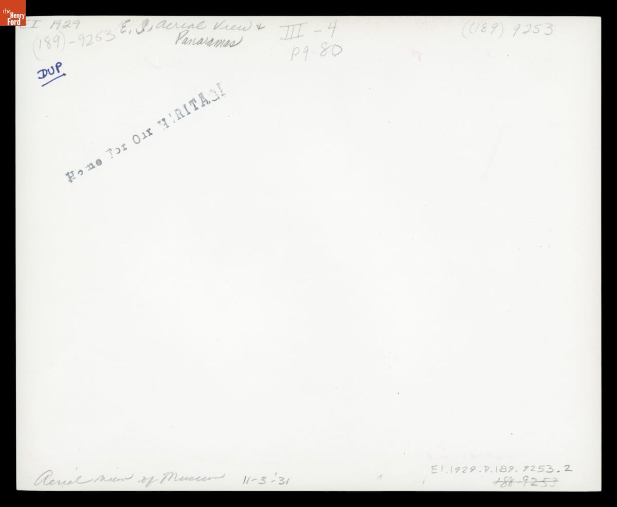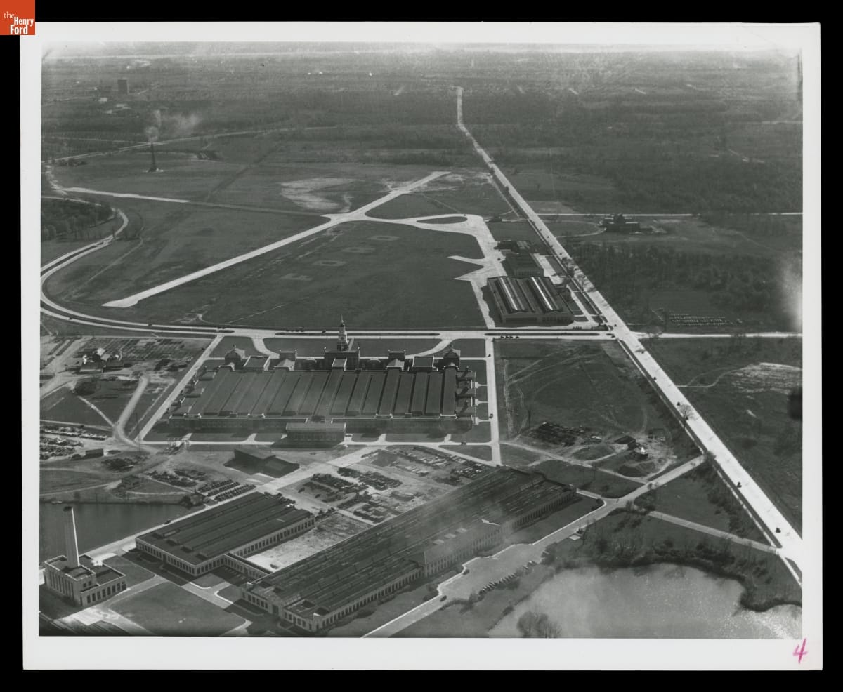 In 1929, Henry Ford began construction on a museum located between Ford Airport, visible in the upper portion of this photograph, and the Ford Engineering Laboratory, situated at the bottom of the image. This view captures the scale of Ford's museum building as well as its prominent facade: a replica of Philadelphia’s Independence Hall.