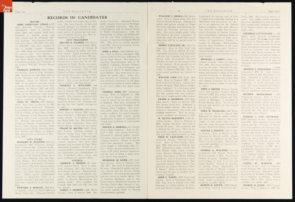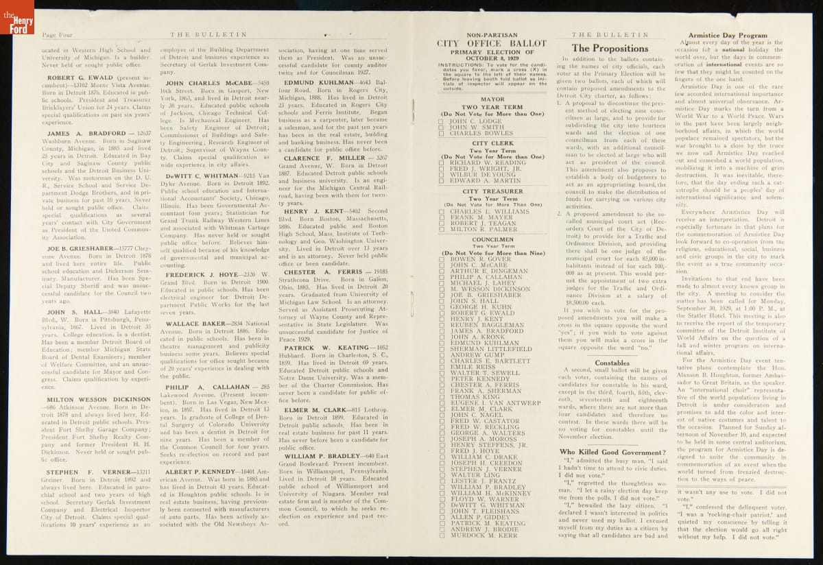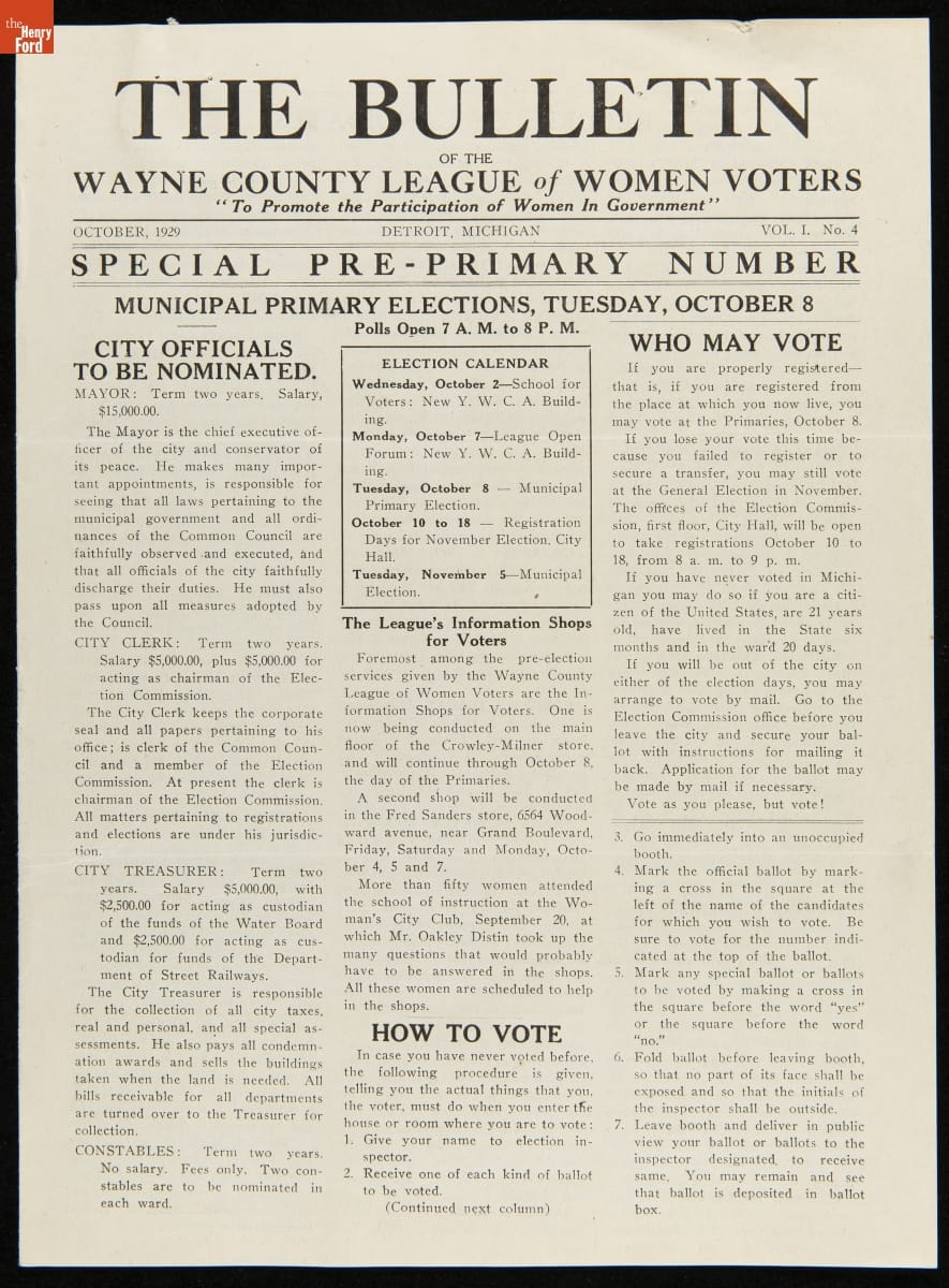 This issue of The Bulletin of the Wayne County League of Women Voters provided helpful voting instructions and information related to the 1929 municipal primary elections. The Bulletin contains concise descriptions of candidates' records and an article for first-time voters. Readers also found news about other issues important to the organization.