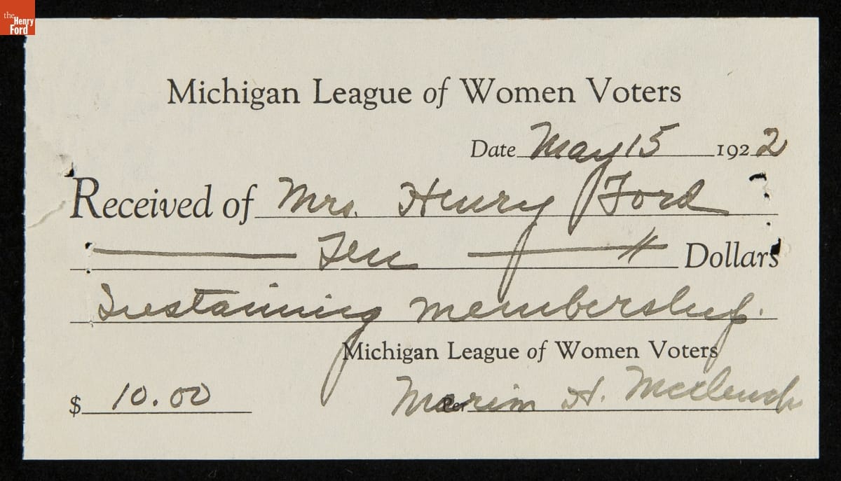 Receipt from Michigan League of Women Voters to Sustaining Member Clara Ford (Mrs. Henry Ford), May 15, 1922