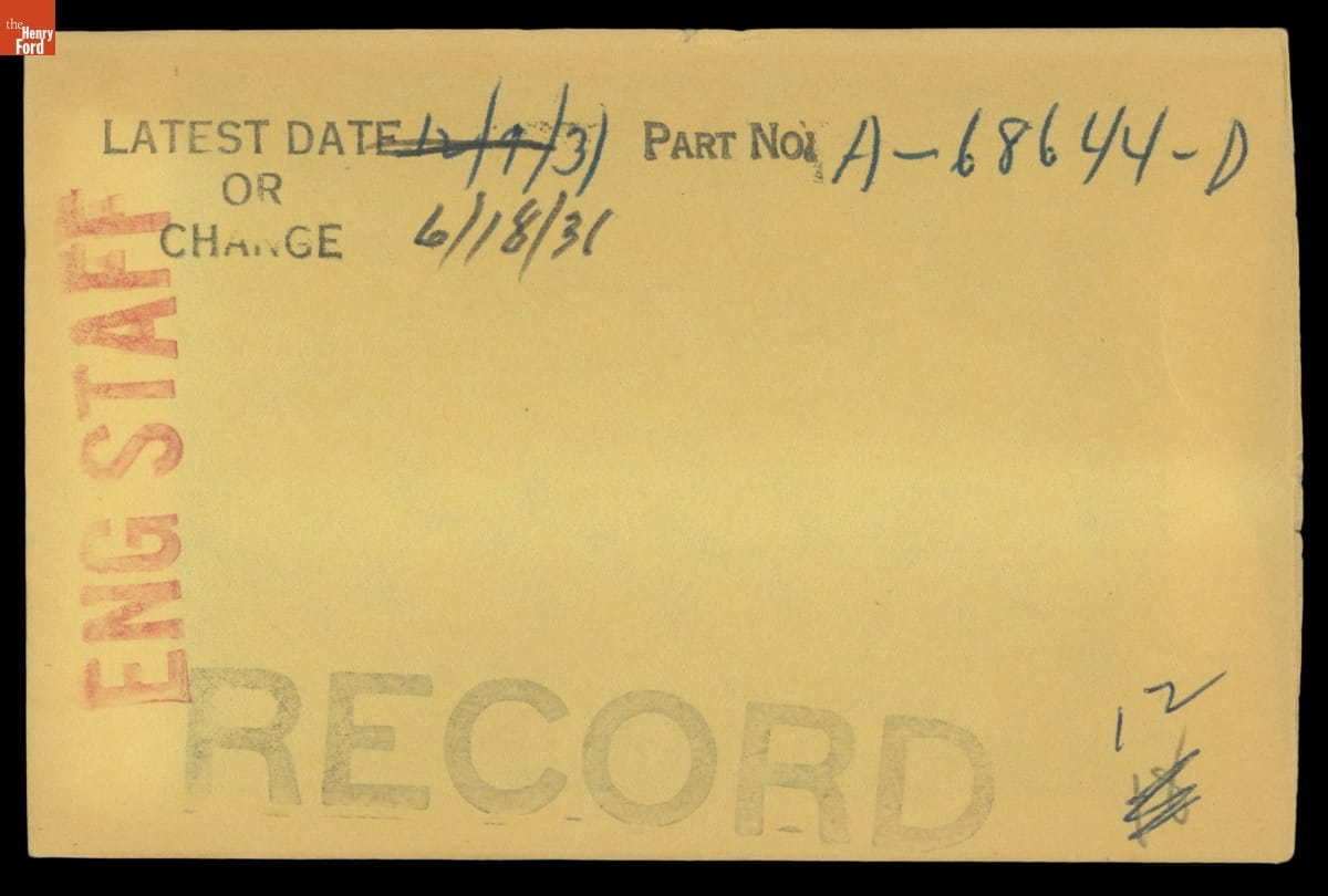 The Ford Motor Company created over a million parts drawings from 1903 to 1957. Many of these drawings specify engineering requirements for the components of Ford-made vehicles--including automobiles, trucks, tractors, military vehicles and Tri-motor airplanes. Others document assembly components, stages of casting and forging, or experimental designs. Beginning in the 1940s, Ford transferred the drawings to microfilm.