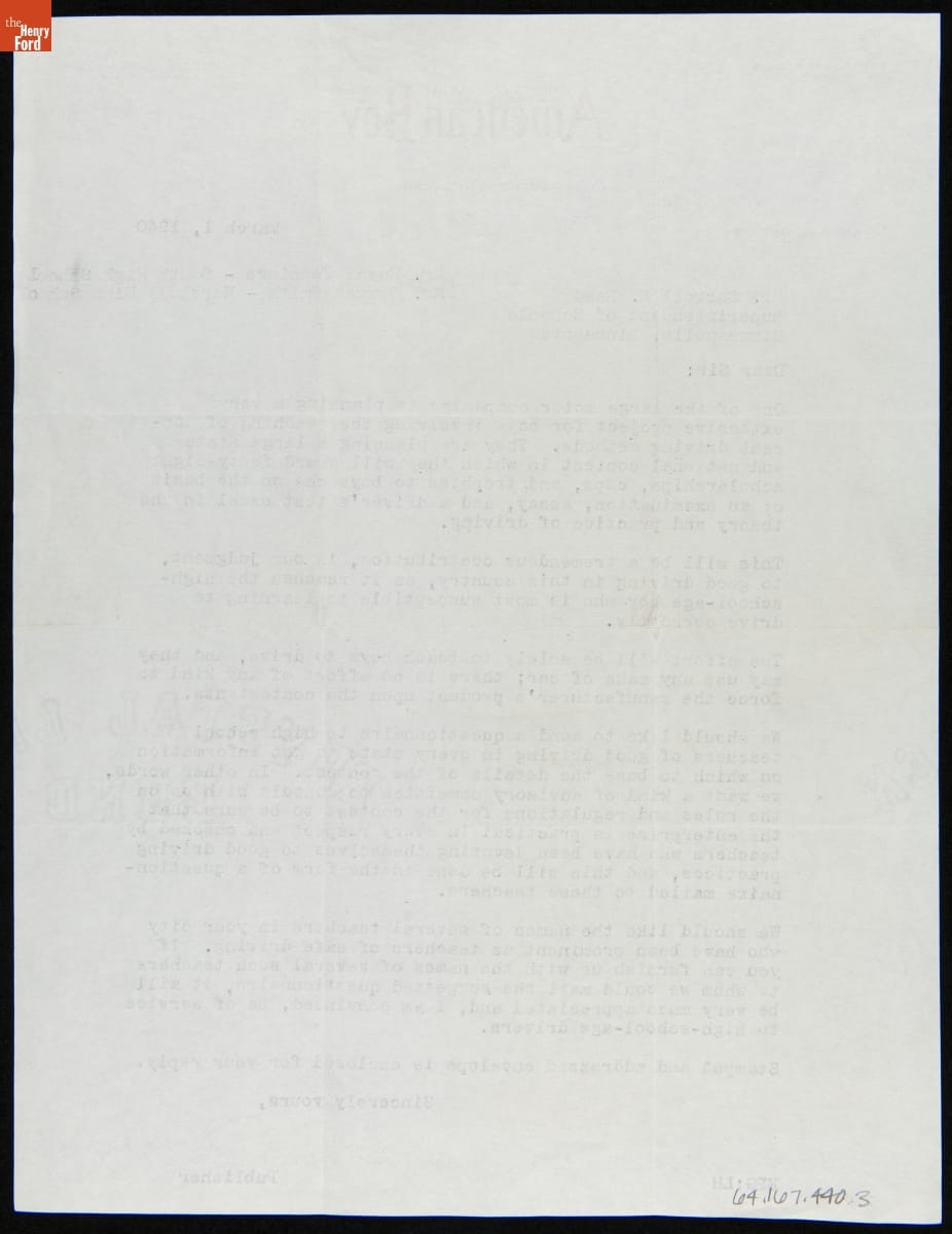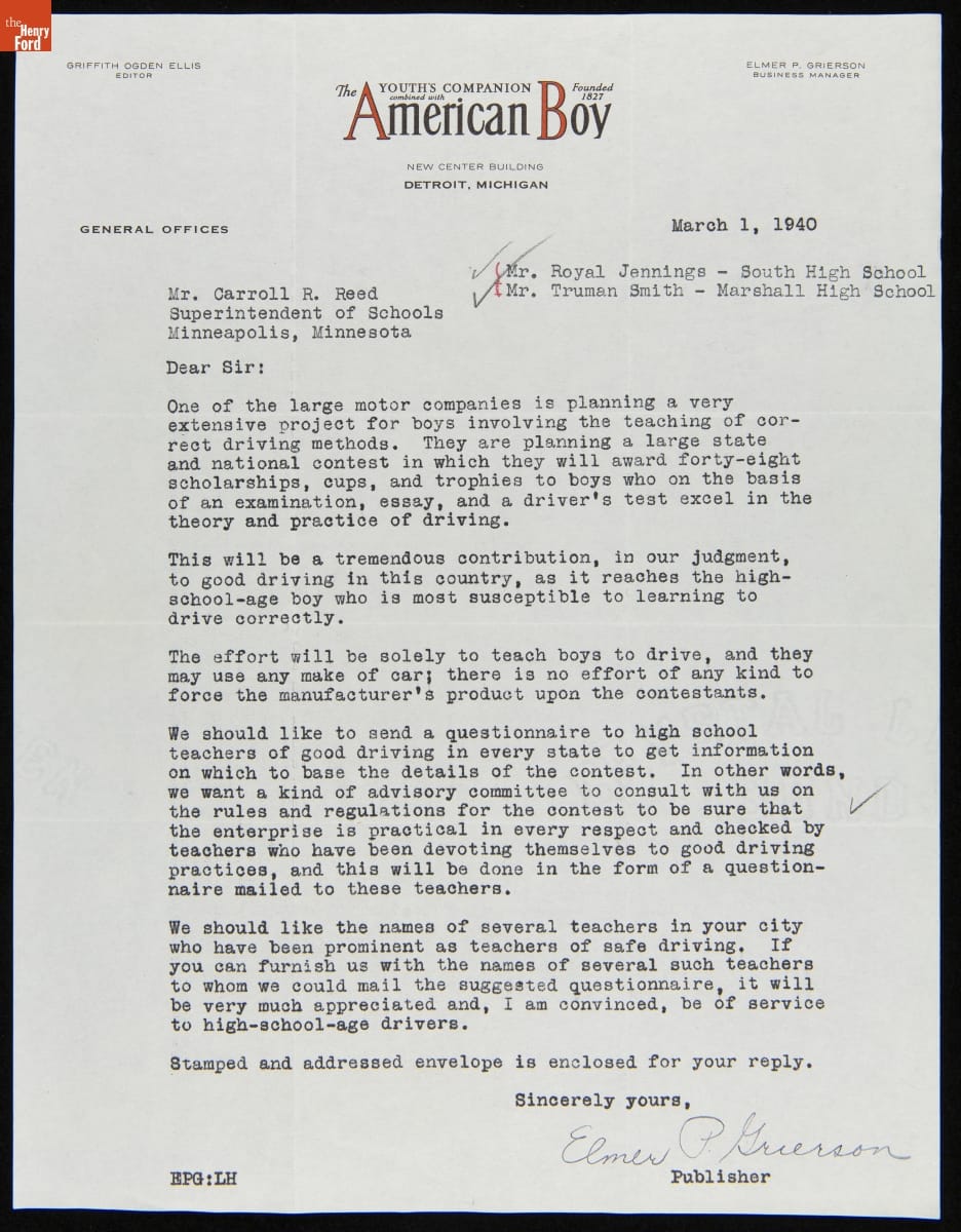 Ford Motor Company created the Ford Good Drivers League in 1940 to promote safe driving habits among high school students. Young drivers would compete in state and national championships, which included a driving test. Elmer Grierson, the publisher of The American Boy magazine, was among the organization's supporters. Grierson reached out to state school systems for advice on structuring the League's driving contests.