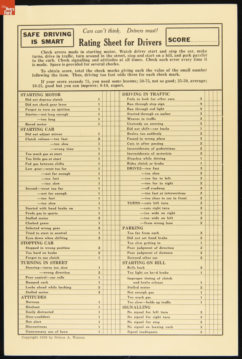 Ford Motor Company created the Ford Good Drivers League in 1940 to promote safe driving habits among high school students. Young drivers could compete in state and national championships, which included a driving test. The League's staff surveyed driving instructors throughout the country for ways to best score a contestant's abilities. One instructor sent this rating sheet as an example.