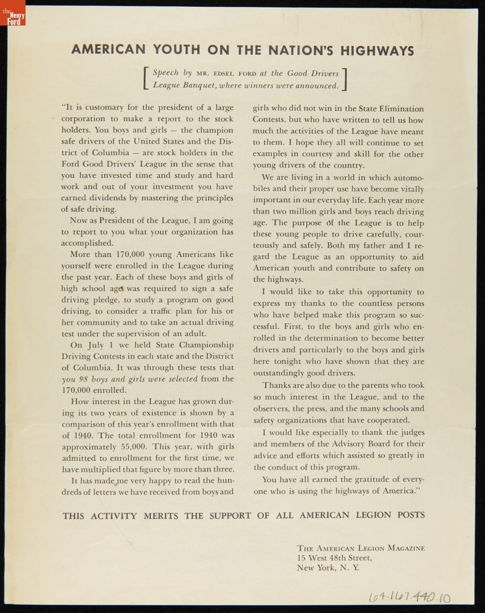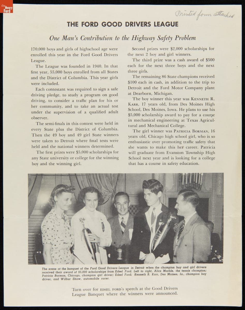 Ford Motor Company created the Good Drivers League in 1940. Headed by Edsel Ford, the League promoted safe driving habits among high school students. The League initially invited boys to compete in state and national championships--girls would join in 1941. Contestants wrote essays and participated in driving tests. National champions won trophies and scholarships. America's entry into World War II ended the program.