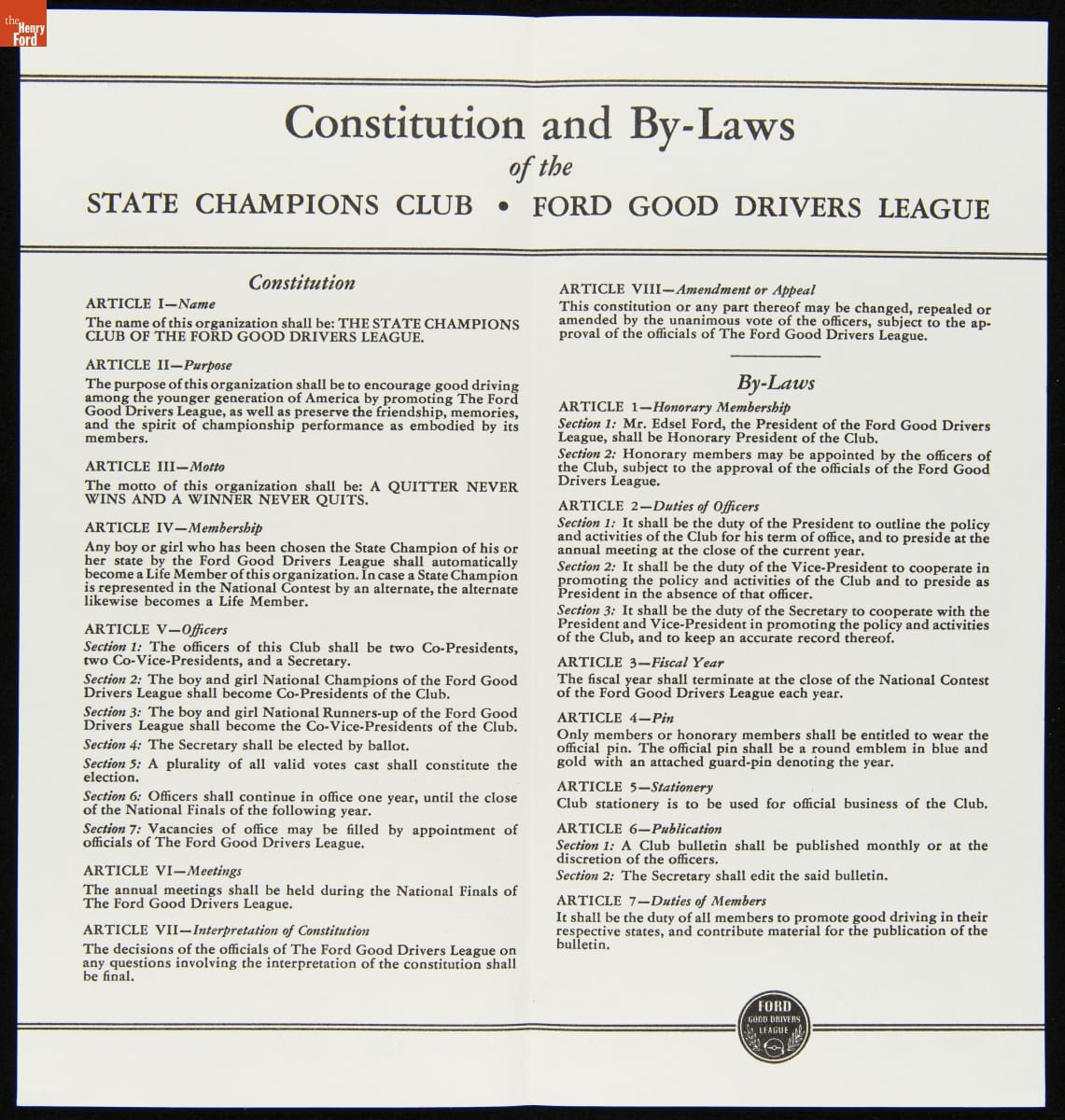 Constitution and By-Laws of the State Champions Club, Ford Good Drivers League, 1941-1942