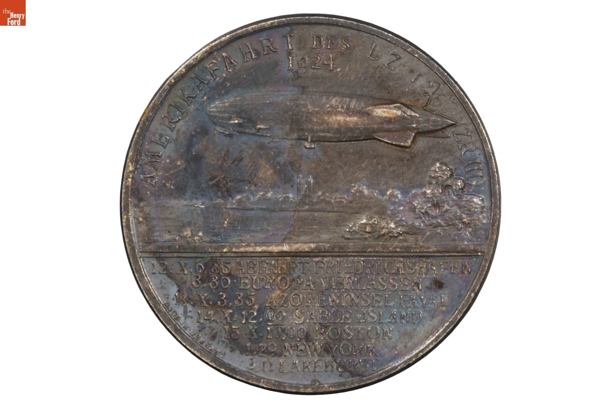 This medallion commemorated Dr. Hugo Eckener's successful delivery of the airship LZ126 (later the USS Los Angeles) to the United States Navy in 1924. The airship was part of Germany's reparations following World War I. Eckener, depicted on the front, headed up the Zeppelin Company--the airship's manufacturer. He later commanded another airship, Graf Zeppelin, on its famous around-the-world flight.