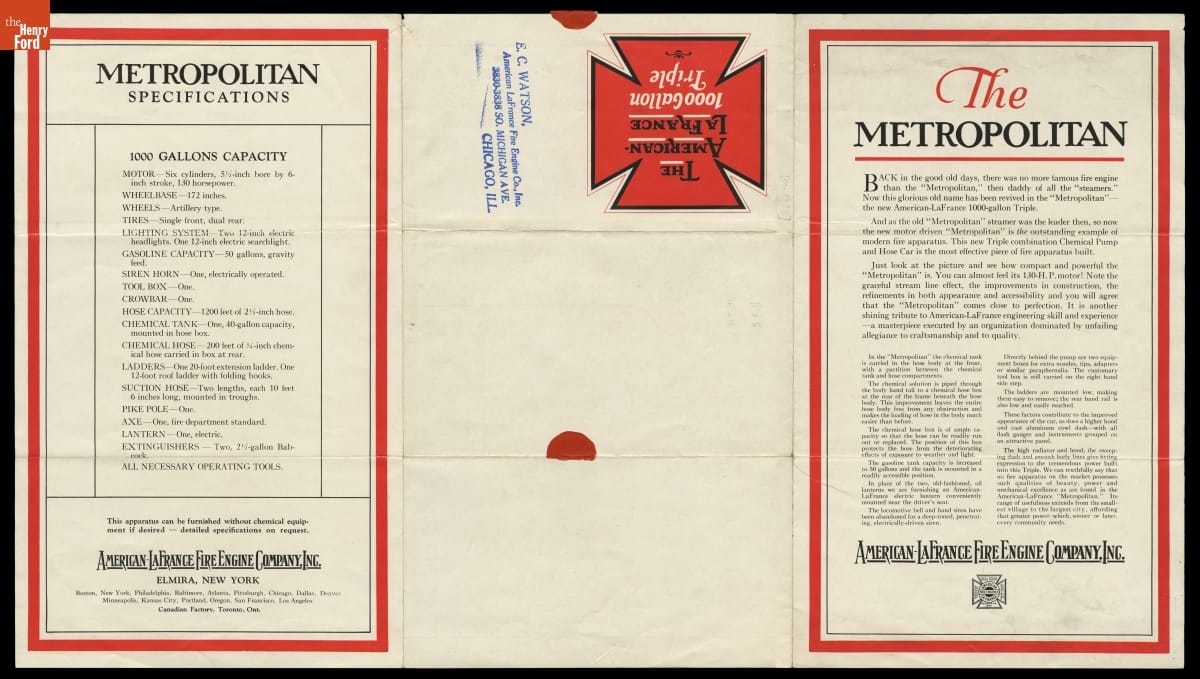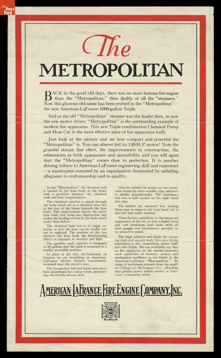 American-LaFrance Fire Engine Company Catalog, "The Metropolitan Triple Combination Pumper," circa 1925