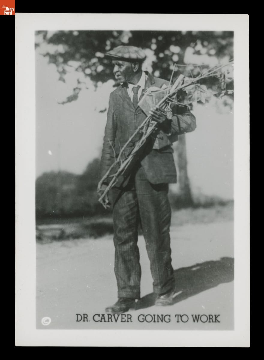 Prentice H. Polk, official photographer for Tuskegee Institute, documented renowned agricultural scientist George Washington Carver in this photograph carrying plant stalks back to his laboratory around 1940. After Carver's death, the Carver Seal Committee began selling this and other images to help build the endowment of the George Washington Carver Foundation (formed in 1940).