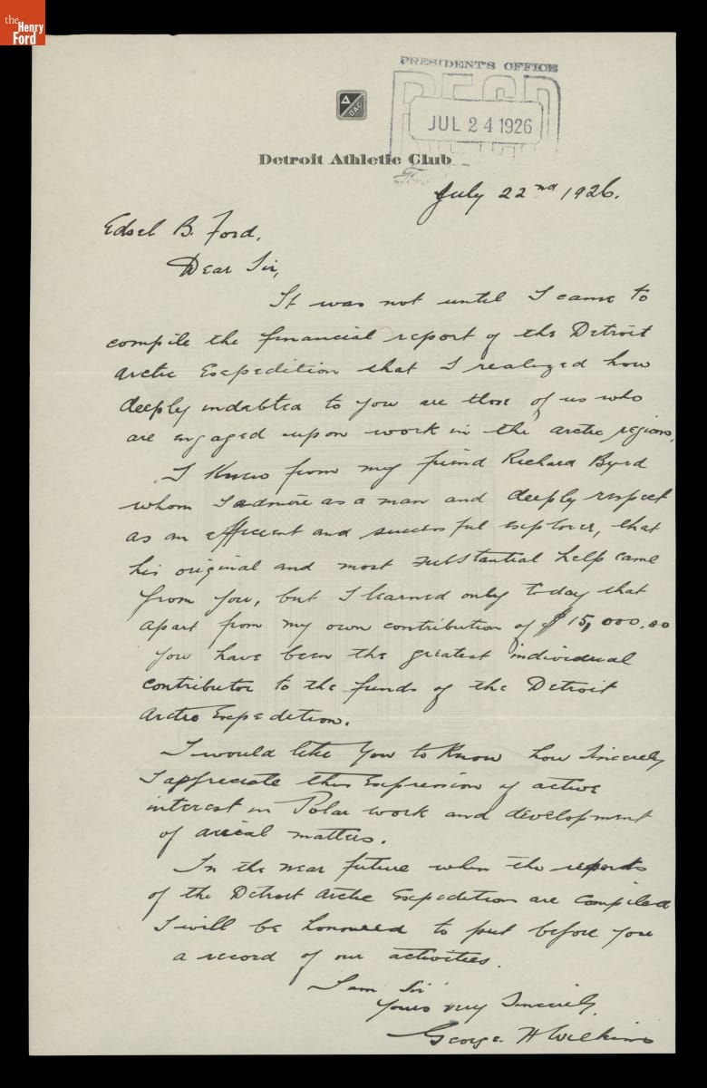 Letter from Sir George H. Wilkins to Edsel Ford, July 22, 1926
