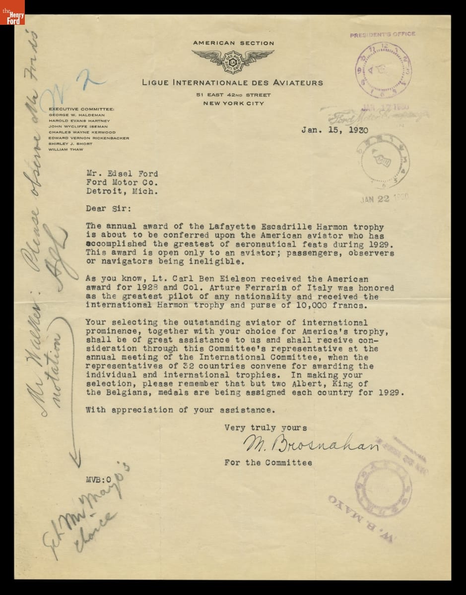 Letter from Ligue Internationale Des Aviateurs to Edsel Ford, January 15, 1930