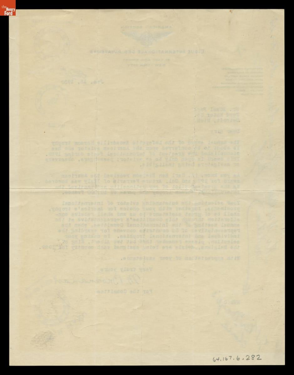 The Ligue International des Aviateurs (the International League of Aviators) awarded annual trophies to outstanding aviators and aeronauts beginning in 1926. Each year, the League solicited opinions from well-known individuals, such as Edsel Ford, with ties to aviation to help select trophy recipients. Ford consulted with William B. Mayo, head of Ford's Aircraft Division, before making his recommendations.