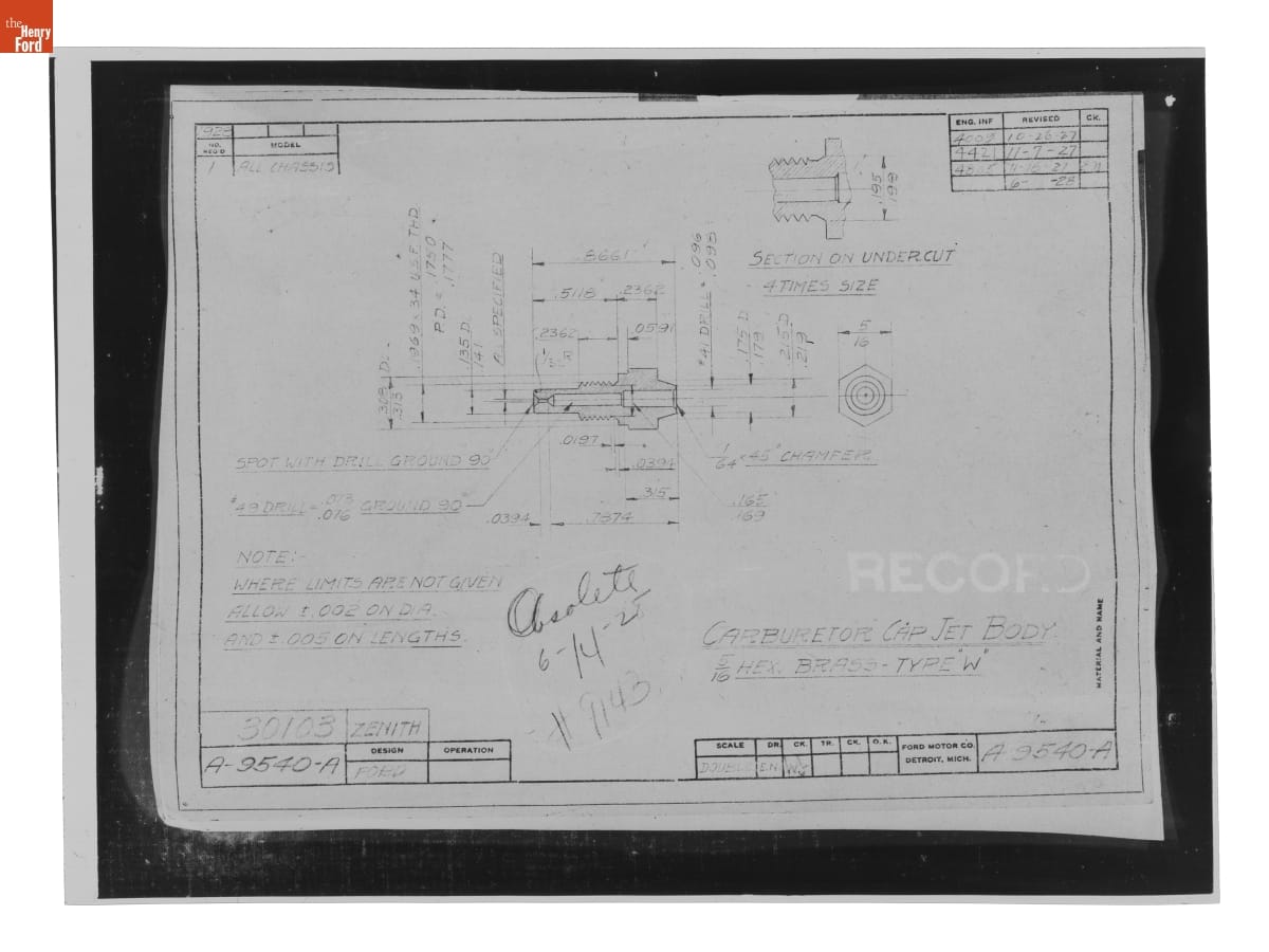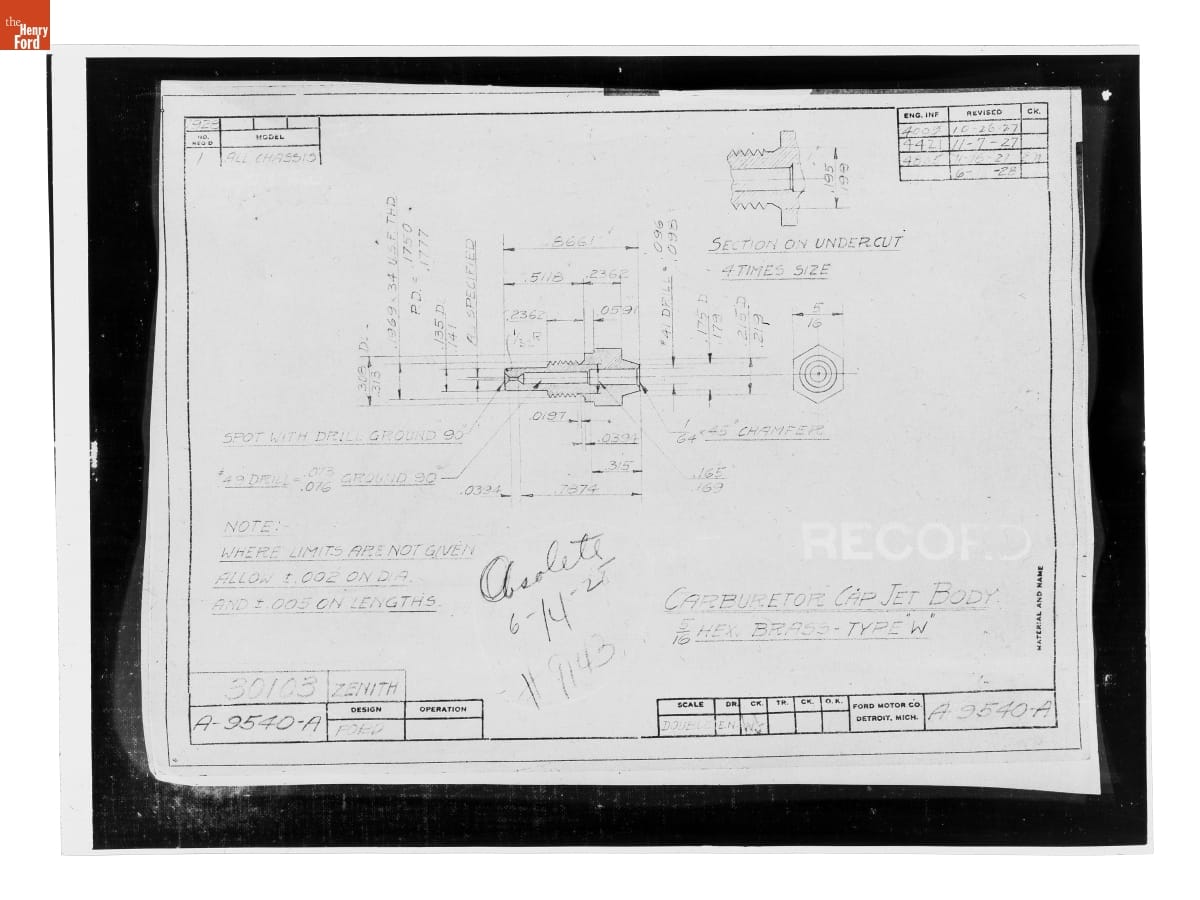 Drawing, "Carburetor Cap Jet Body," Ford Model A, June 14, 1928