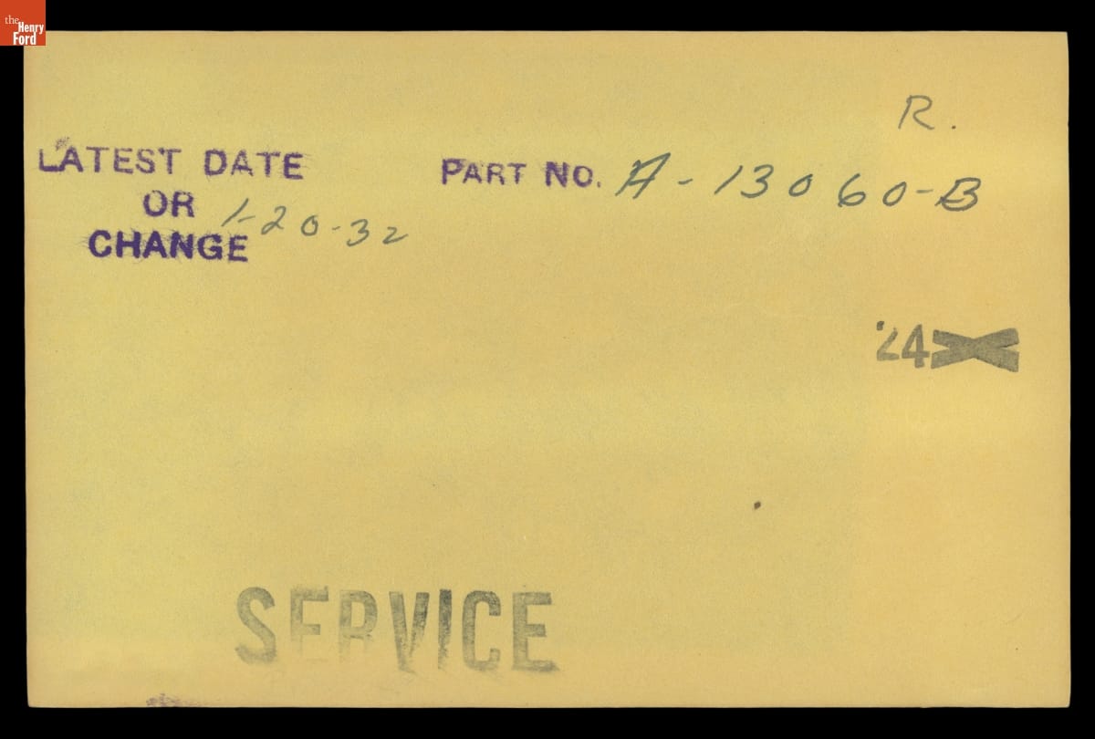 The Ford Motor Company created over a million parts drawings from 1903 to 1957. Many of these drawings specify engineering requirements for the components of Ford-made vehicles--including automobiles, trucks, tractors, military vehicles and Tri-motor airplanes. Others document assembly components, stages of casting and forging, or experimental designs. Beginning in the 1940s, Ford transferred the drawings to microfilm.