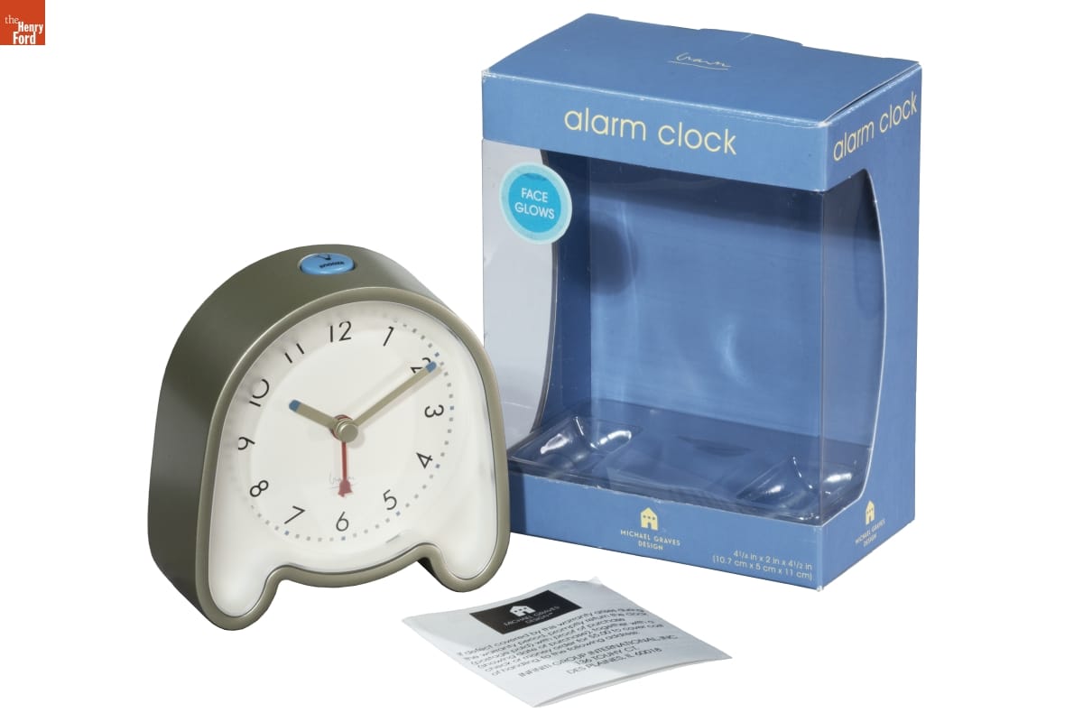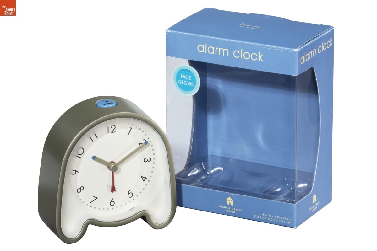 alarm clock / FACE / GLOWS / MICHAEL GRAVES / DESIGN / 4 1/4 in x 2 in x 4 1/2 in / (10.7 cm x 5 cm x 11 cm)