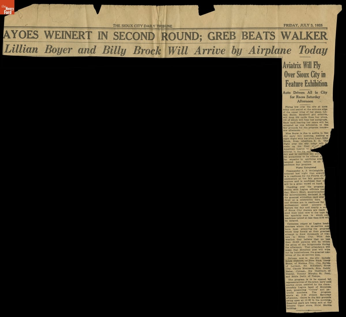 Newspaper Article, "Lillian Boyer and Billy Brock Will Arrive by Airplane Today," July 3, 1925