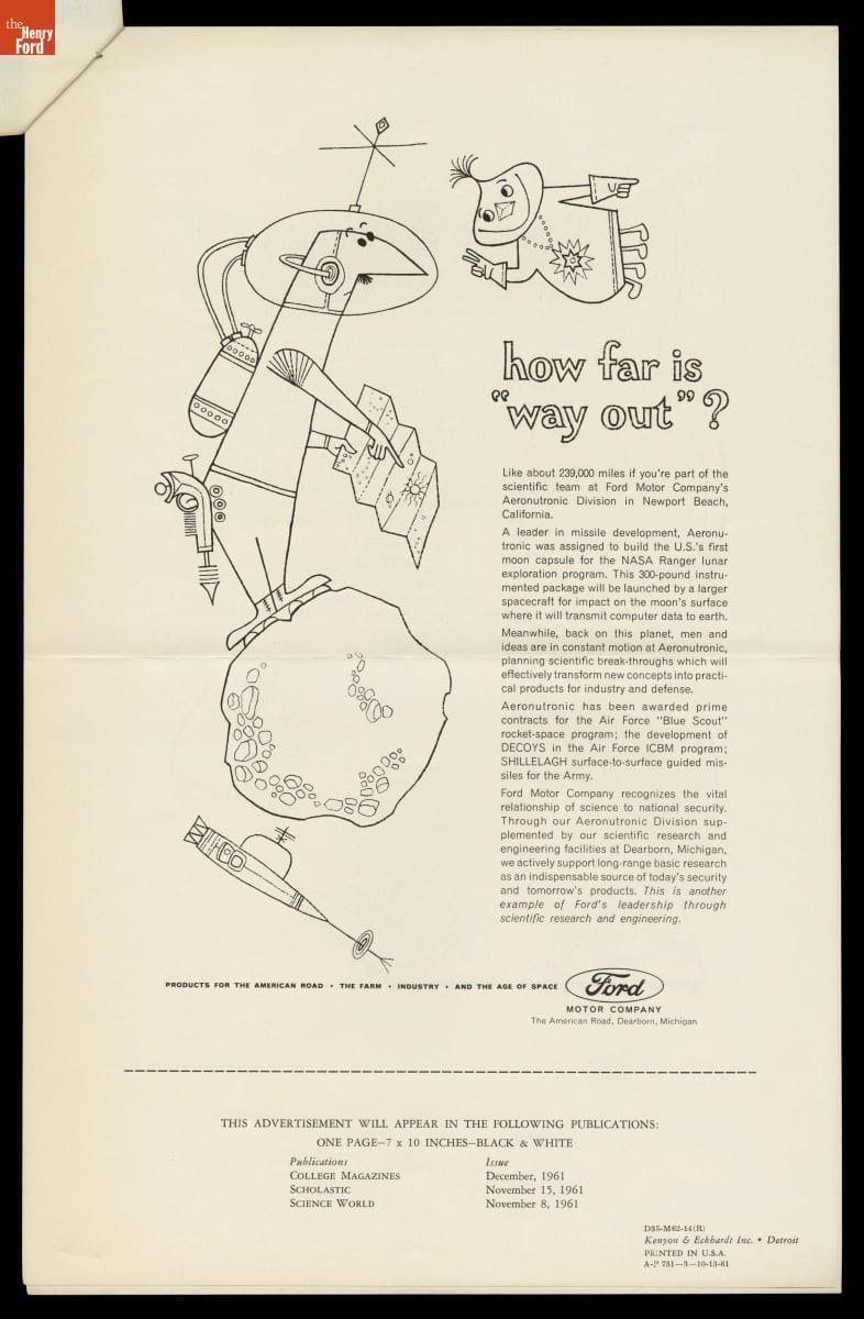 Ford Aeronutronic Division Advertising, "how far is way out?", and "how quiet is quiet?", November 1961