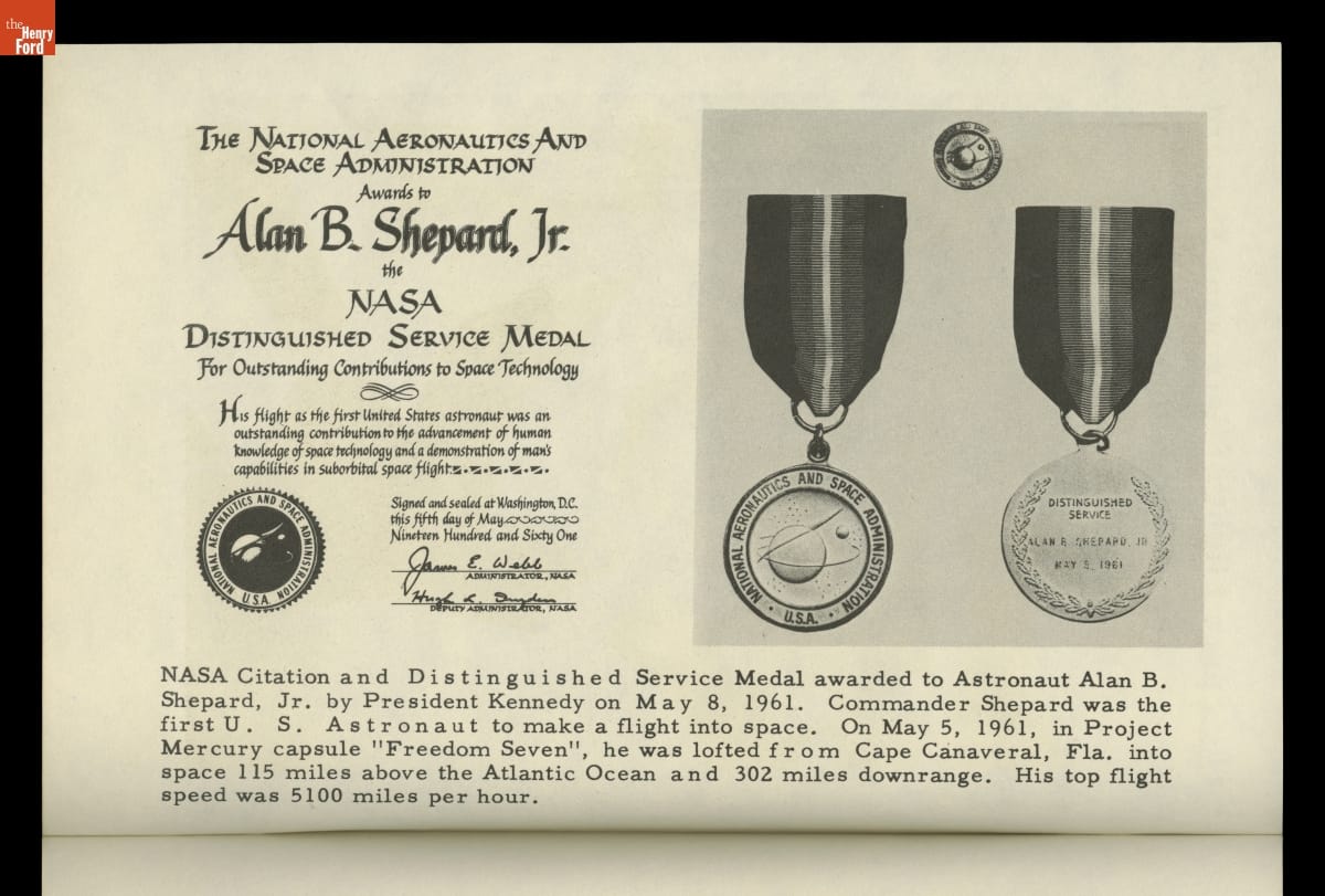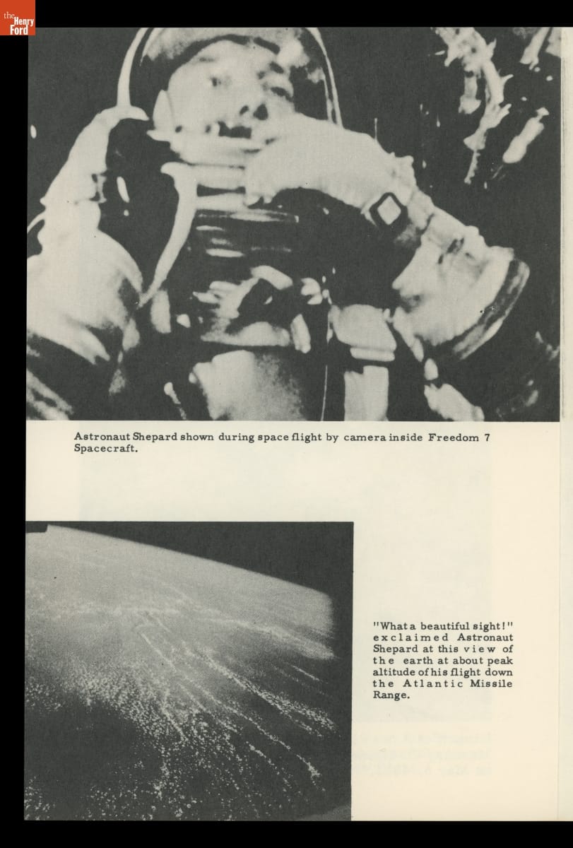 In May 1961, astronaut Alan Shepard became the first American to travel into space. This brochure documents Shepard's flight in the National Aeronautics and Space Administration's Project Mercury capsule Freedom 7. Shepard's sub-orbital flight was the first step toward NASA's goal to orbit a manned spacecraft around Earth. John Glenn's flight in early 1962 in Friendship 7 accomplished that objective.