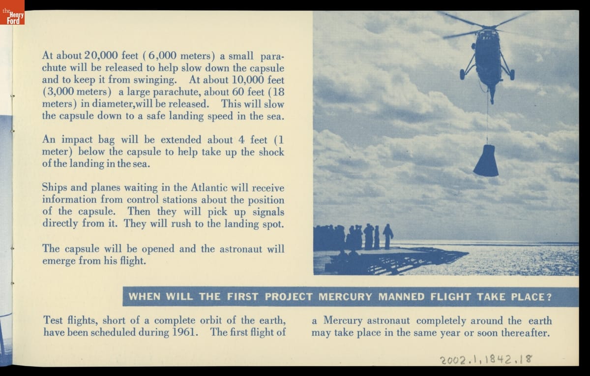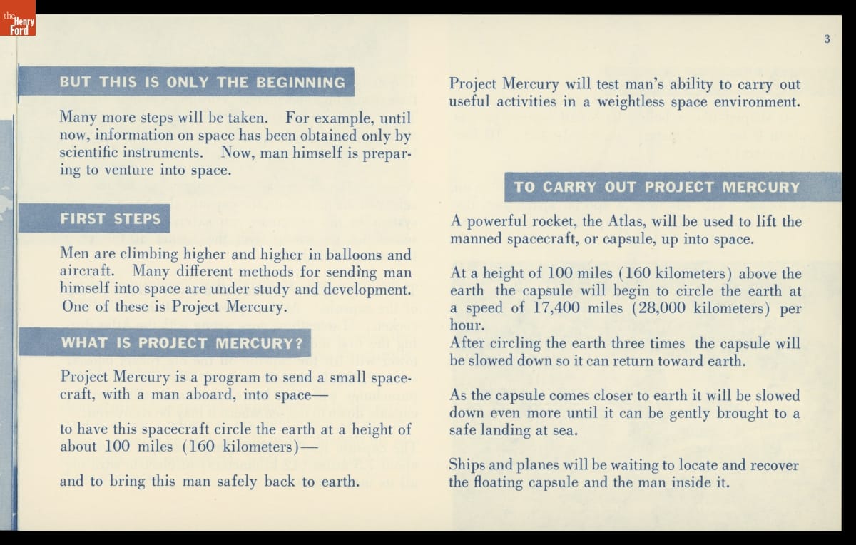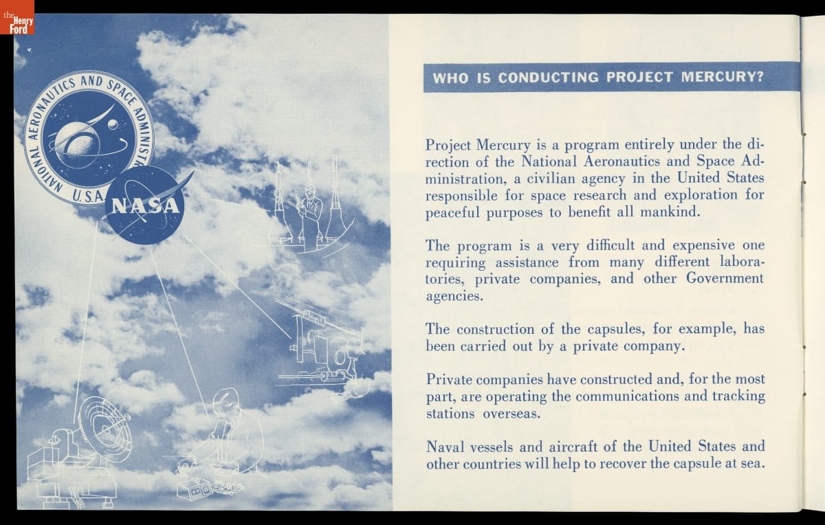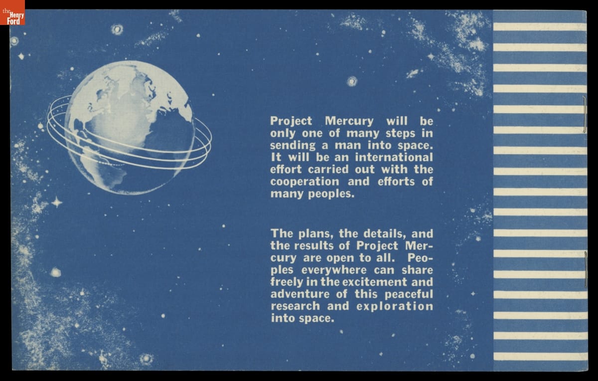 The National Aeronautics and Space Administration developed Project Mercury in 1958 to send a manned spacecraft into orbit. This brochure, published in early 1961, explained NASA's progress toward achieving that goal. Later, in May 1961, NASA would launch its first manned capsule. And in 1962, John Glenn orbited the Earth. Project Mercury ended in 1963 after six successful crewed missions.