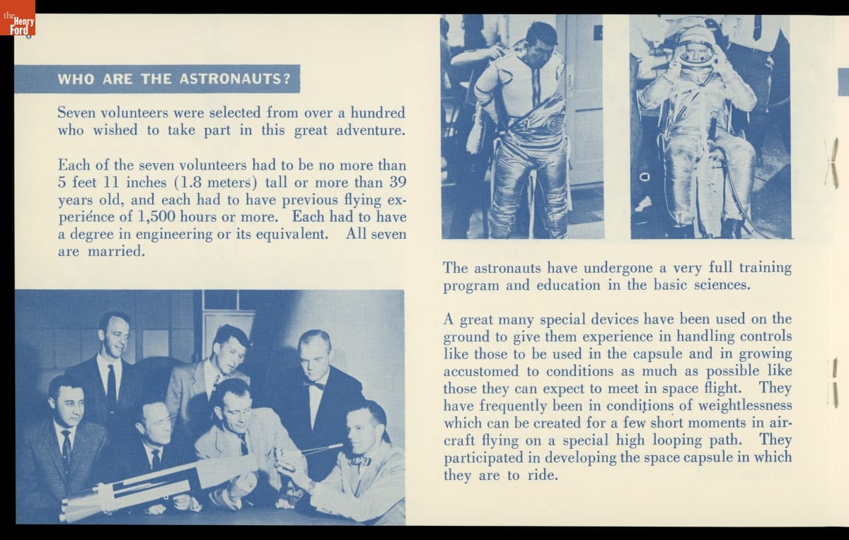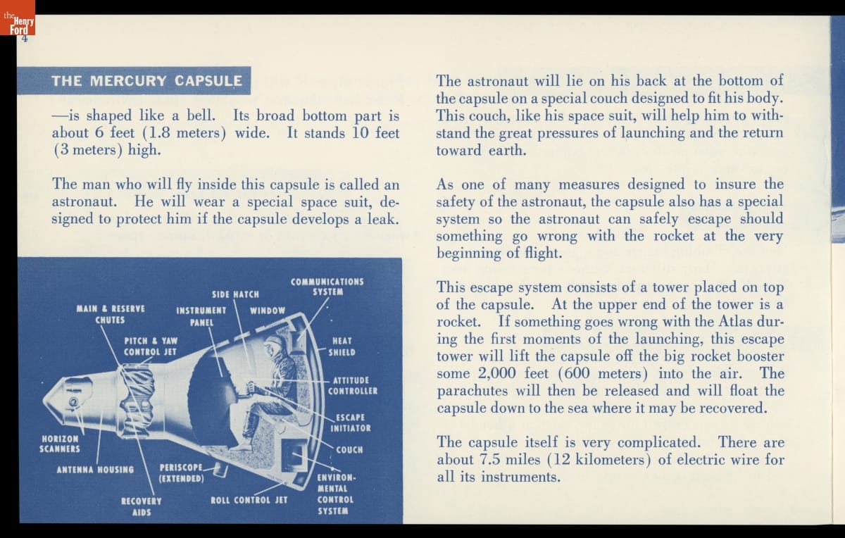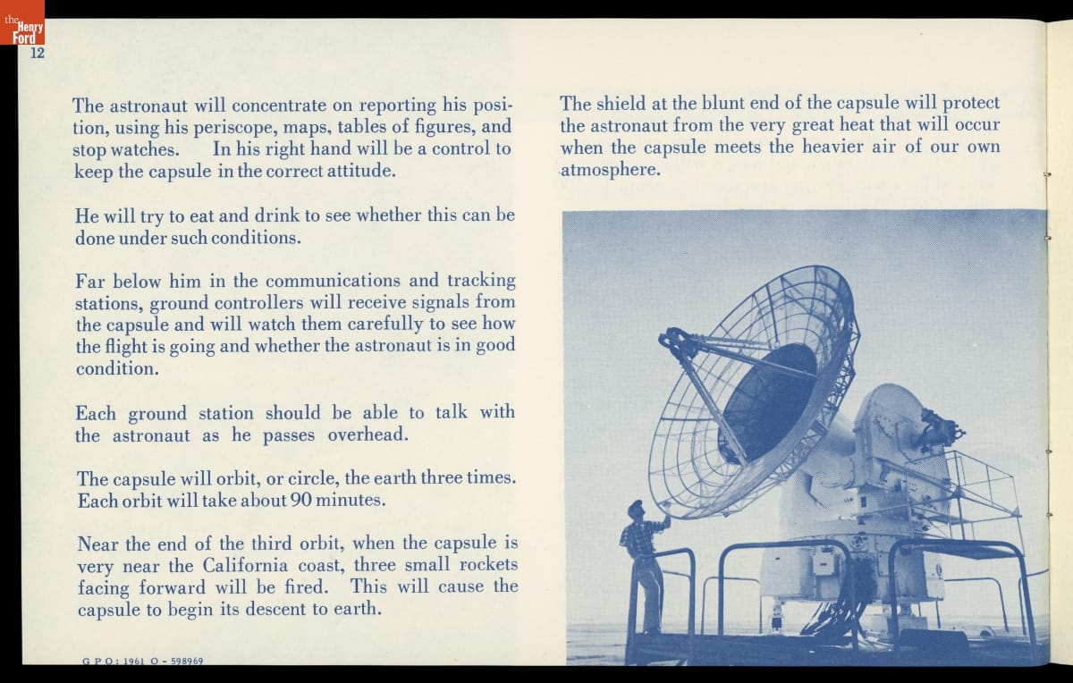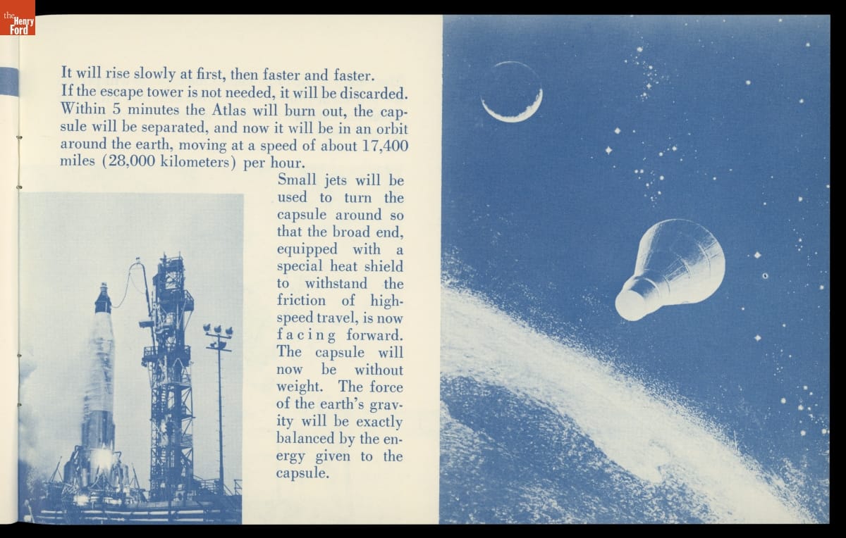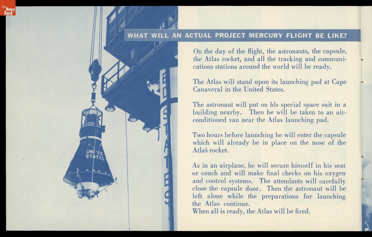 The National Aeronautics and Space Administration developed Project Mercury in 1958 to send a manned spacecraft into orbit. This brochure, published in early 1961, explained NASA's progress toward achieving that goal. Later, in May 1961, NASA would launch its first manned capsule. And in 1962, John Glenn orbited the Earth. Project Mercury ended in 1963 after six successful crewed missions.