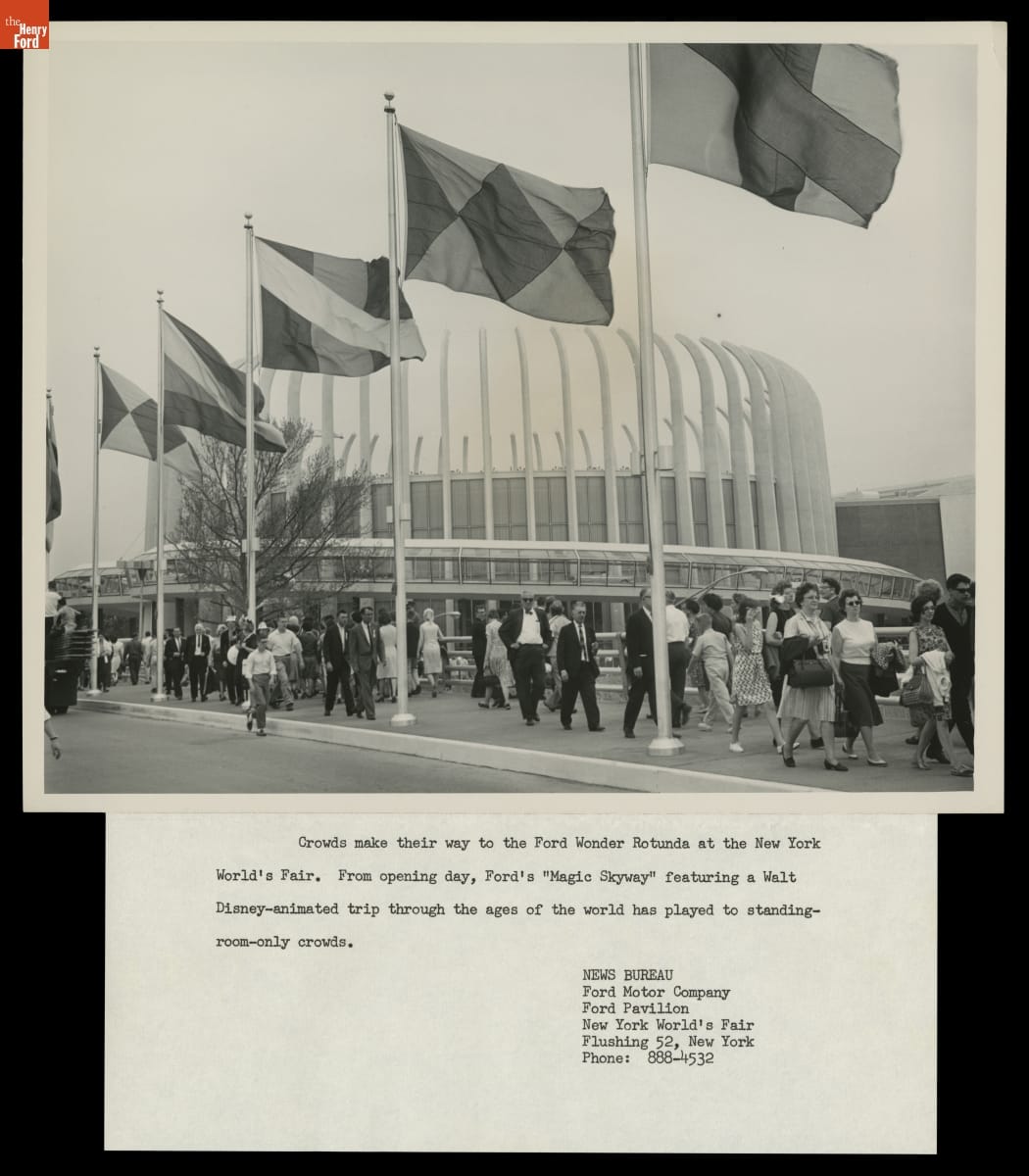 Ford Motor Company brought in Walt Disney to design exhibits for its pavilion at the 1964-1965 New York World's Fair. Visitors waited in long lines for this "unique and memorable entertainment adventure." Once inside, fairgoers encountered displays focusing on Ford's history, global influence, and current products. The highlight was the Magic Skyway ride, in which guests sat in Ford convertibles through a Disney-designed show.