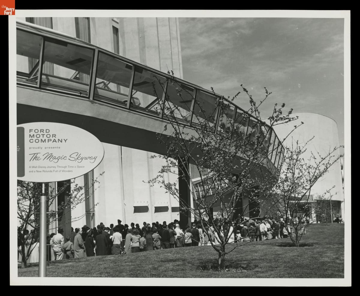 Ford Motor Company brought in Walt Disney to design exhibits for its pavilion at the 1964-1965 New York World's Fair. Visitors waited in long lines for this "unique and memorable entertainment adventure." Once inside, fairgoers encountered displays focusing on Ford's history, global influence, and current products. The highlight was the Magic Skyway ride, in which guests sat in Ford convertibles through a Disney-designed show.