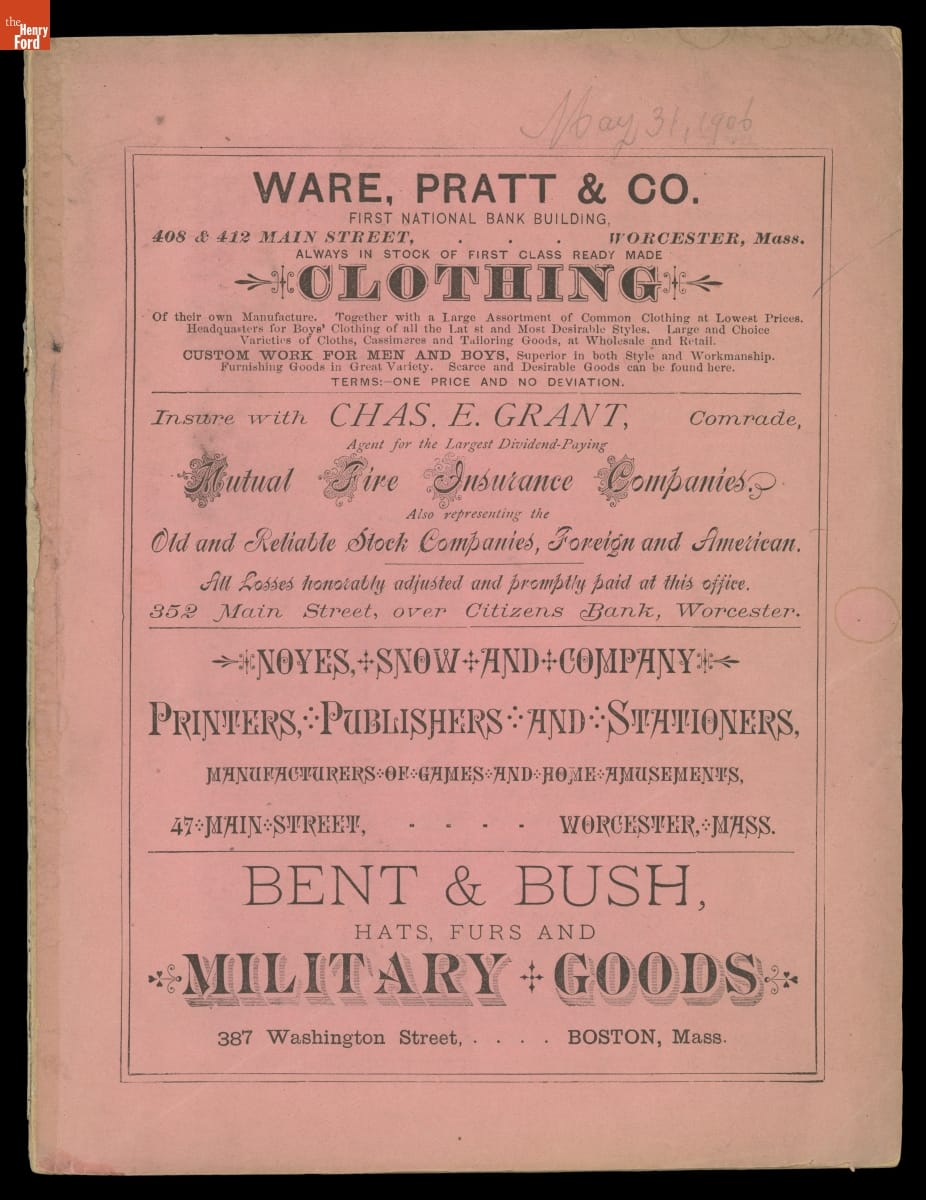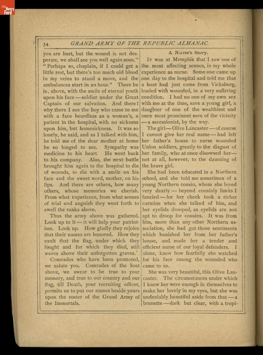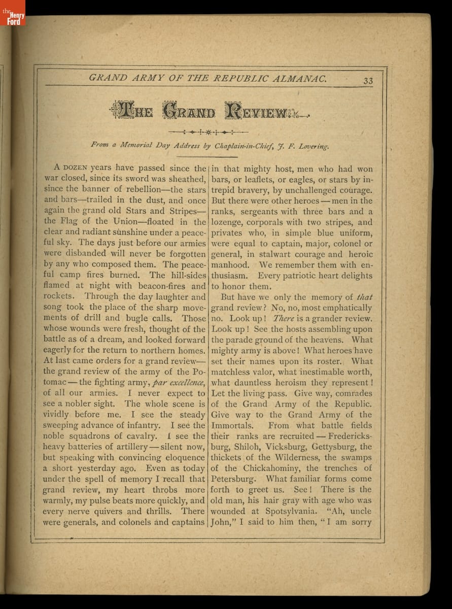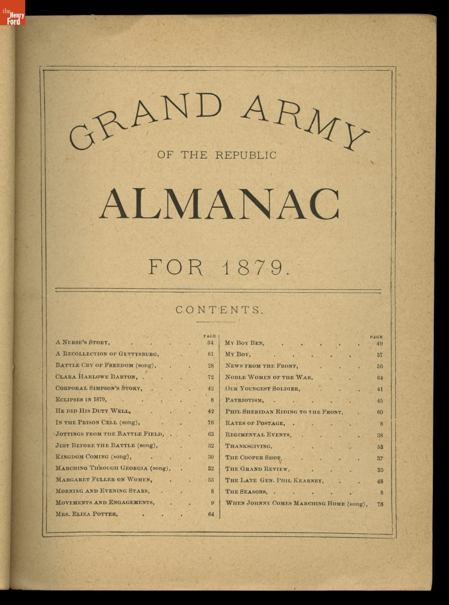 The Grand Army of the Republic (G.A.R.) was a Civil War Union veterans' organization formed in 1866. Local G.A.R. posts sprang up in small towns and big cities, where members came together for camaraderie. G.A.R. members also sponsored Civil War monuments, and pledged to assist needy veterans and their families. By 1890--at its peak--over 400,000 Civil War veterans were G.A.R. members.